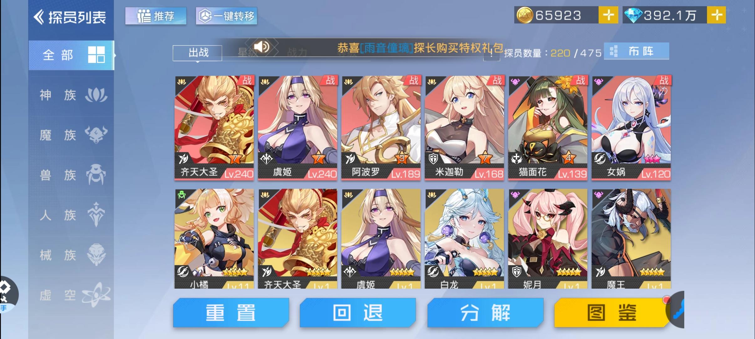 首先,探员分神魔,三系,虚空 简单先说说神魔探员吧,新区萌新神族只需要养嫦娥即可,魔族则是猫面花和伊丽莎白,贝西摩斯,其余的都没用,没啥别的注意点。 三系的可养探员丰富一点,人族:可可,亚瑟,貂蝉,聂隐,兽族:貔貅,虎男,白泽,械族:神乐,蝎子奈奈,血小板,天启,包括准备进精英的黄月英。 虚空:露娜,粉毛的作用点不多,目前只有露娜是有用的 各个系能用的探员我已经列举出来了,讲讲如何搭配吧,首先,阵