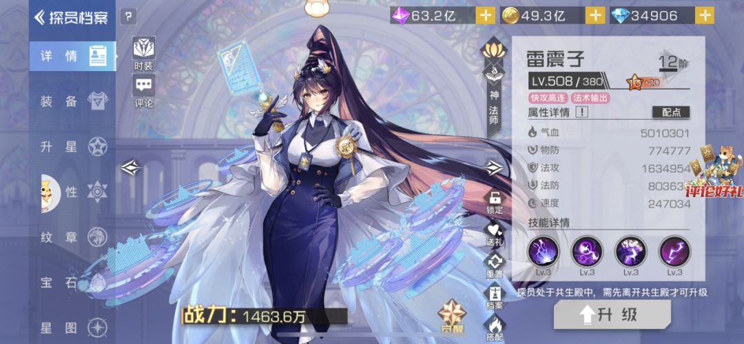玩雷震子一定要觉醒60以上!玩雷震子一定要觉醒60以上!玩雷震子一定要觉醒60以上!重要的事说3遍!雷震子这个探员我很早很早就研究过,当时我的感觉是她的1技能过于鸡肋,要是2技能能第一回合触发就好了,而觉醒恰好就这样改了,并且直接吃掉且增强了1技能! 我们先来看看觉醒雷震子的整体情况,图鉴显示的速度为11760,说明她的基础速度相当不错,并且由于箱子、精英和特异币都可获取,所以有50星的能力,速度