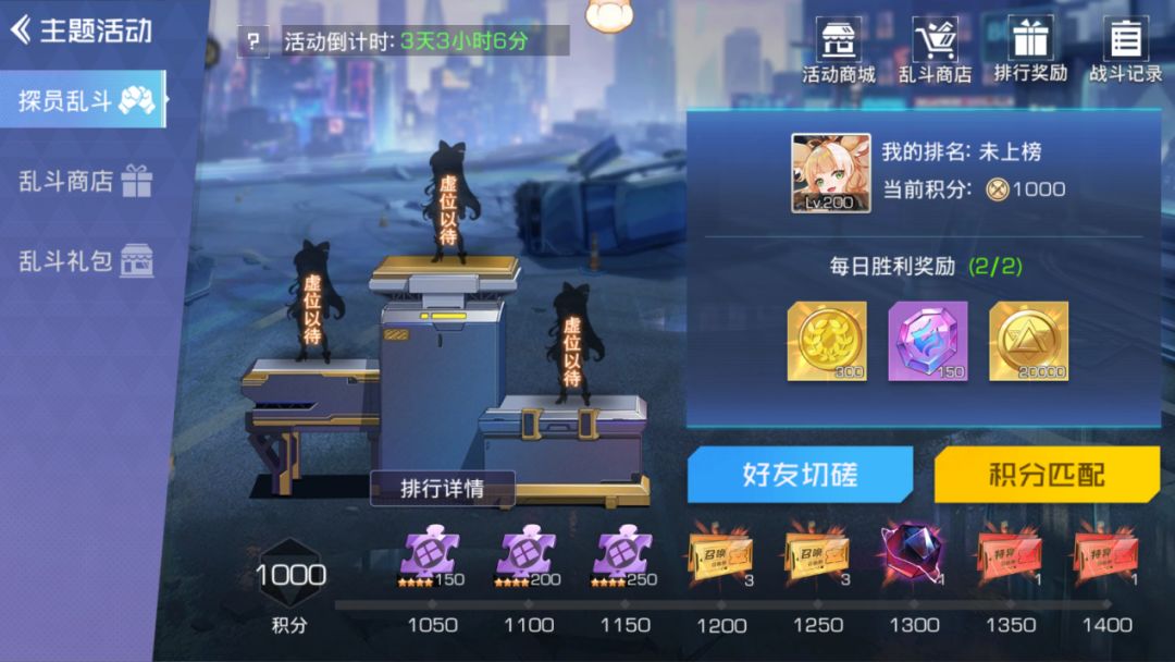 探员大乱斗 1、本活动为双方实时公平布PK策略玩法,活动期间每日20点-23点开启,开场双方随机分配12个高级神话探员,供布阵对战; 2、根据爬塔的进度不同,每位玩家在首次进入活动时,会获得不同的初始积分,最高1175分; 3、活动中,可使用的探员为统一的探员池,不受玩家个人已获得探员限制; 4、所有探员380级,20星,满属性,对阵中不含精灵、秘武等系统; 5、布阵分为3个阶段,每个阶段30秒可