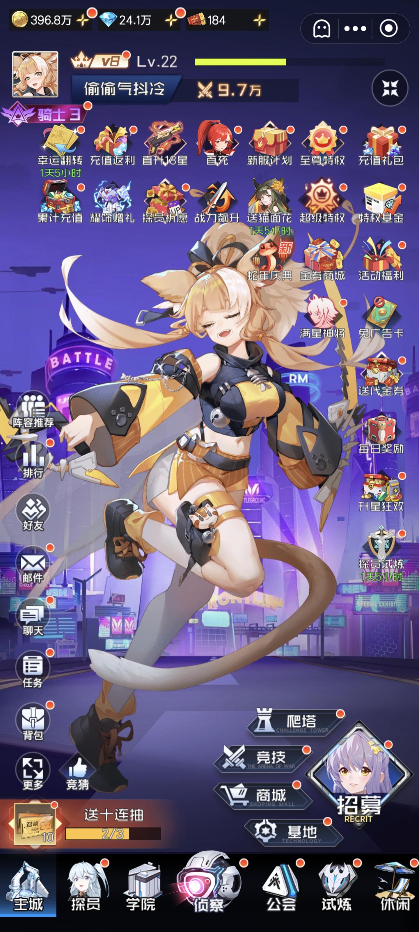 关于白嫖玩家最好的翻身活动就是50探员集结活动,如果在v10及一下建议从二周尾到第三周就可以开始囤资源了,因为这个时候擂台赛正好结束共四期,反正前期把战力冲一下基本定好了,后面也没必要浪费资源了,建议屯包括高抽特抽五星碎片,彩卷,钻石,钻石建议买打折高抽和4折以下的碎片,到了第三周开始有限时召唤,4000钻可以买十张彩卷,建议买满留着,到五十天应该有150抽,正好一起做活动,五十天主要活动就是获得