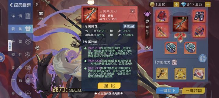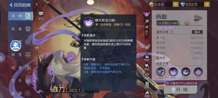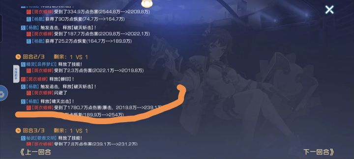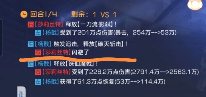 首先,杨戬的一二技能和大招都能连击,触发的追击不能。也就是说在触发连击的情况下,杨戬在第一回合就能给对面的单位挂满十层被动,第二回合就能打出专武的斩杀效果。 然后就是这个专武的斩杀效果了,每次攻击触发一次,多段伤害算是一次攻击;这个斩杀伤害不是必中,可以暴击(如图,可被闪避),连击可触发,追击可触发,触发之后10层【破灭】buff保留,不会被清空。也就是说叠满十层【破灭】buff后杨戬的每一次攻