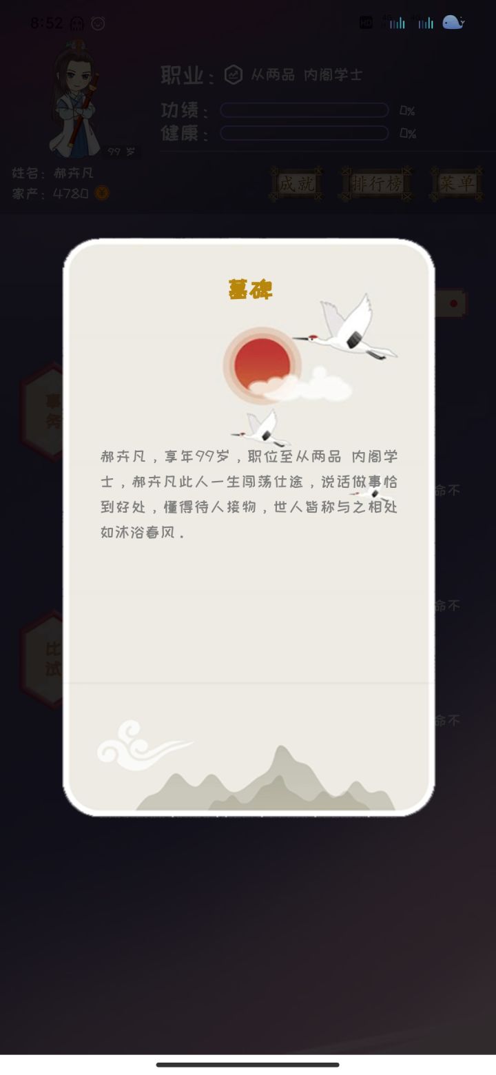 本来财富和官职能刷到最好,财富卡bug60岁左右的时候,8000多的财富清零了就不刷了,然后疯狂下一年最后苟到了99。