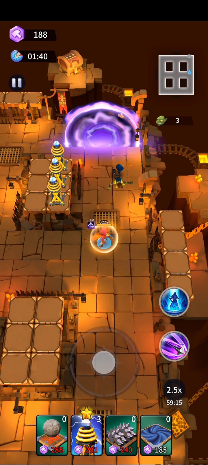 在这一关卡有了新陷阱——切割机的加入,地面陷阱的输出更加强力。在此关卡内最重要的是在拐角点的塔的放置。前期将重炮拉到最高级。在最后的督军BOSS出现后,英雄可以跟着BOSS的路线环绕攻击BOSS,注意布置一些地面陷阱来拖住boss的移动。在后面只剩下BOSS时可以将前方的建筑拆掉,着重布置勇气水晶附近的塔。