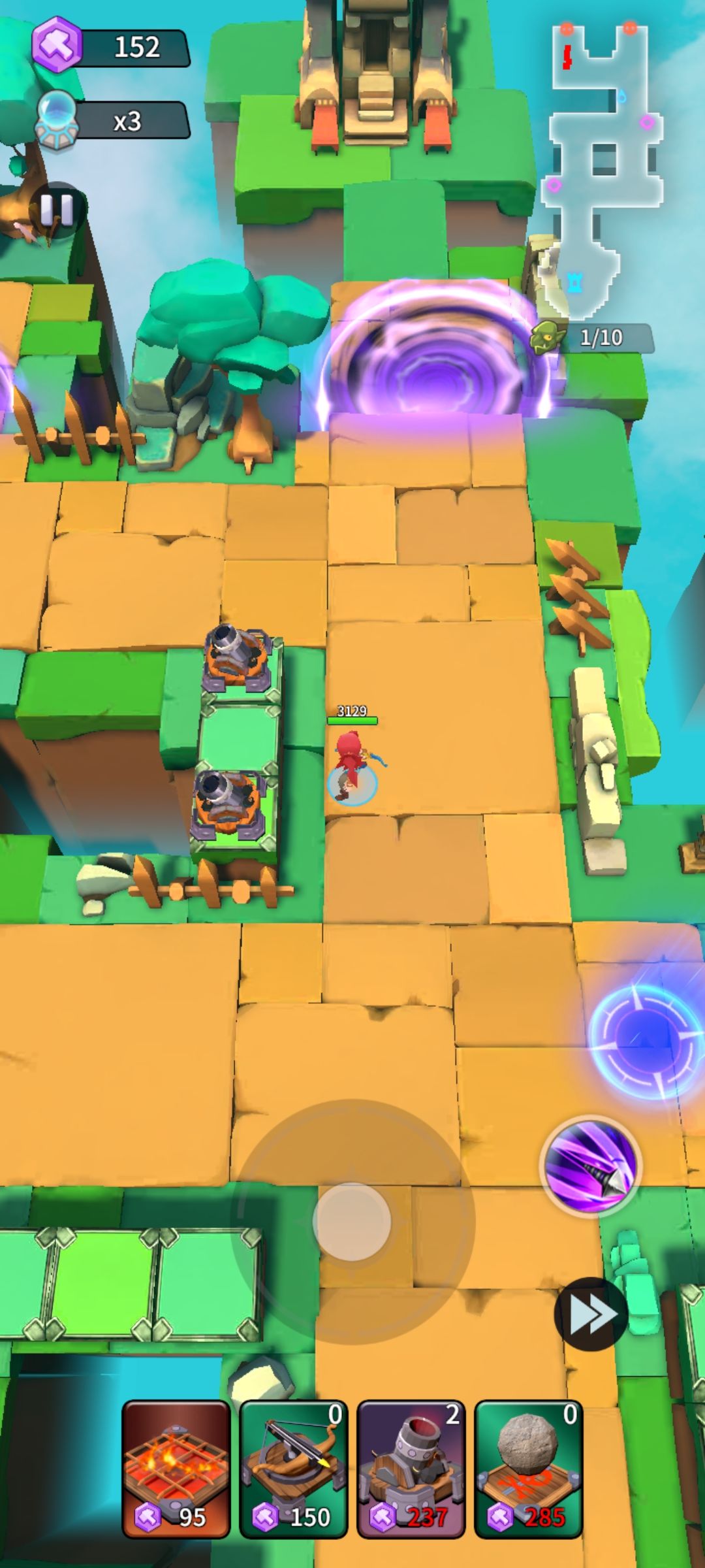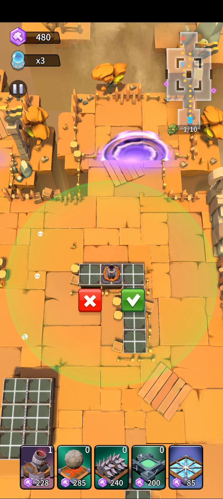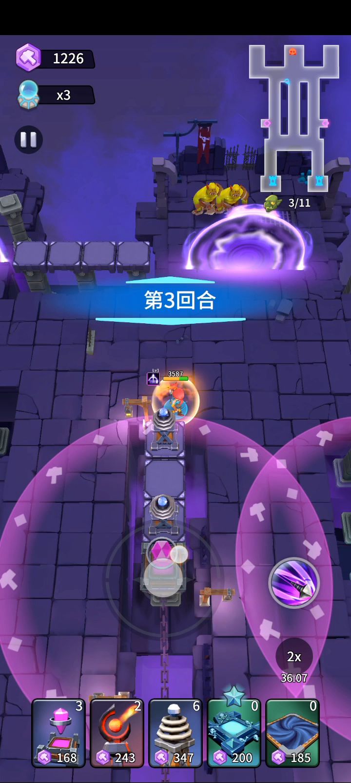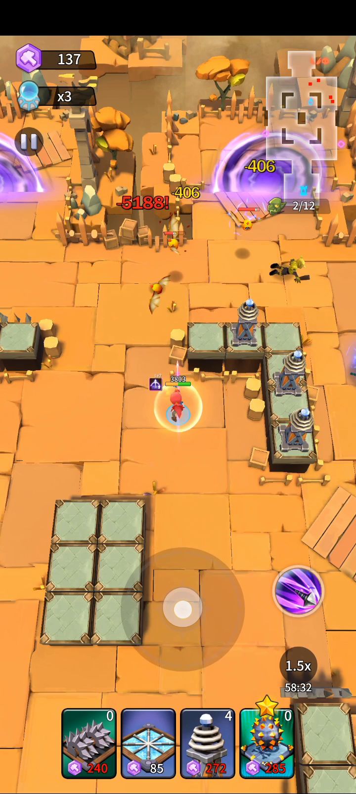 原谅我不想用冰陷阱被折磨,没有墓地的话可以把切割机换成火塔,墓地换成稻草人,不过稻草人没这么容易抗伤,在防御没成型之前要多跑一下补伤害。