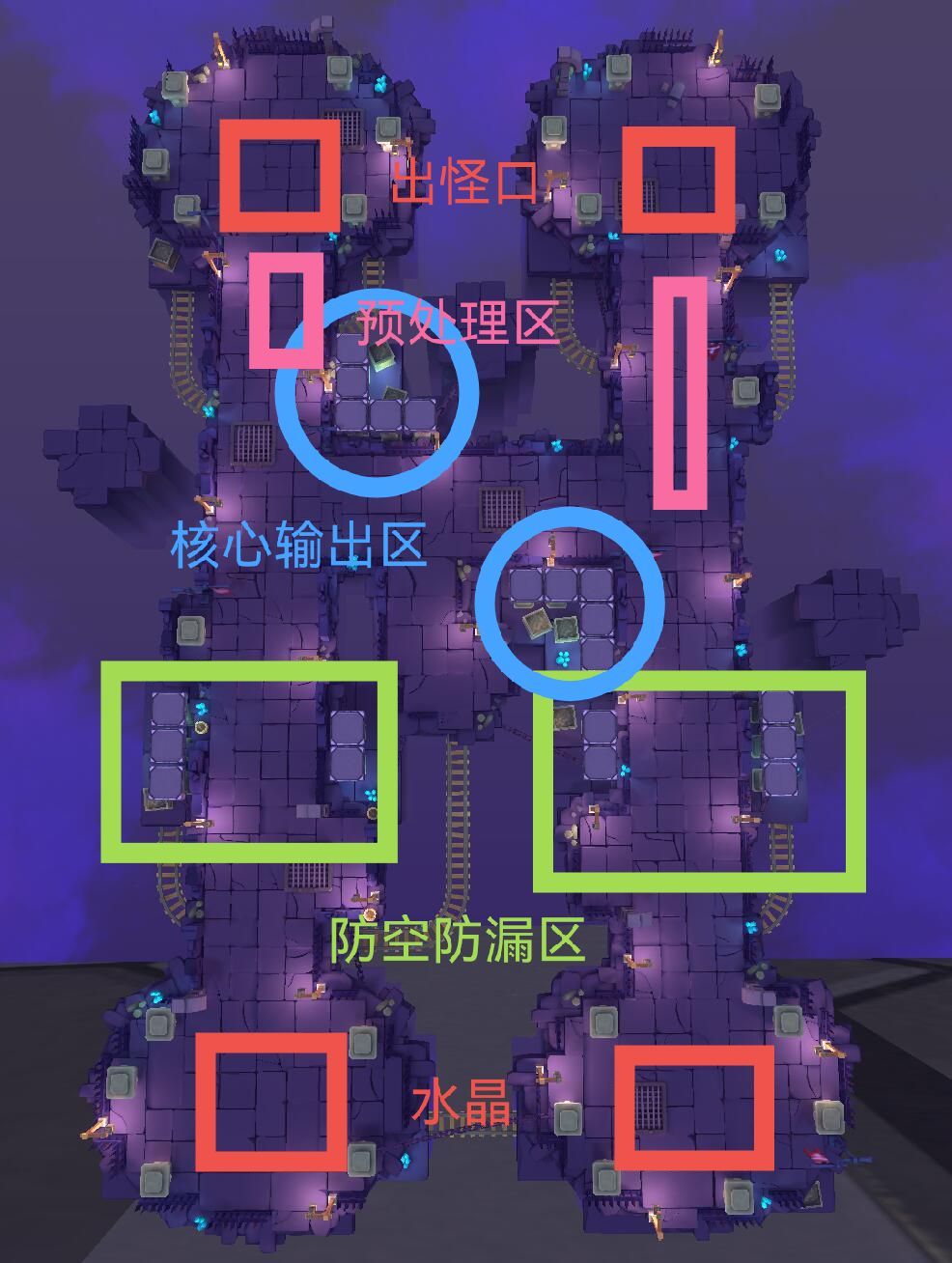 授人以鱼不如授人以渔,大部分关卡只要有了思路就会很简单,当然特别难的关卡会后续出视频攻略 就拿3-3来说,大致分为以上几个区,每张图分好区就好打。 防空防漏区:很多人漏飞机是因为你预想的防空塔再输出地面部队,所以飞行怪就漏了,这里我才用了分流的思路,地面部队我们可以采用高额的aoe伤害或者减速控制,与空军分离。同时空军血少数量相对来说也算少,弩塔喷火塔就是最好的处理方式,同时就算是极速怪漏过去了,