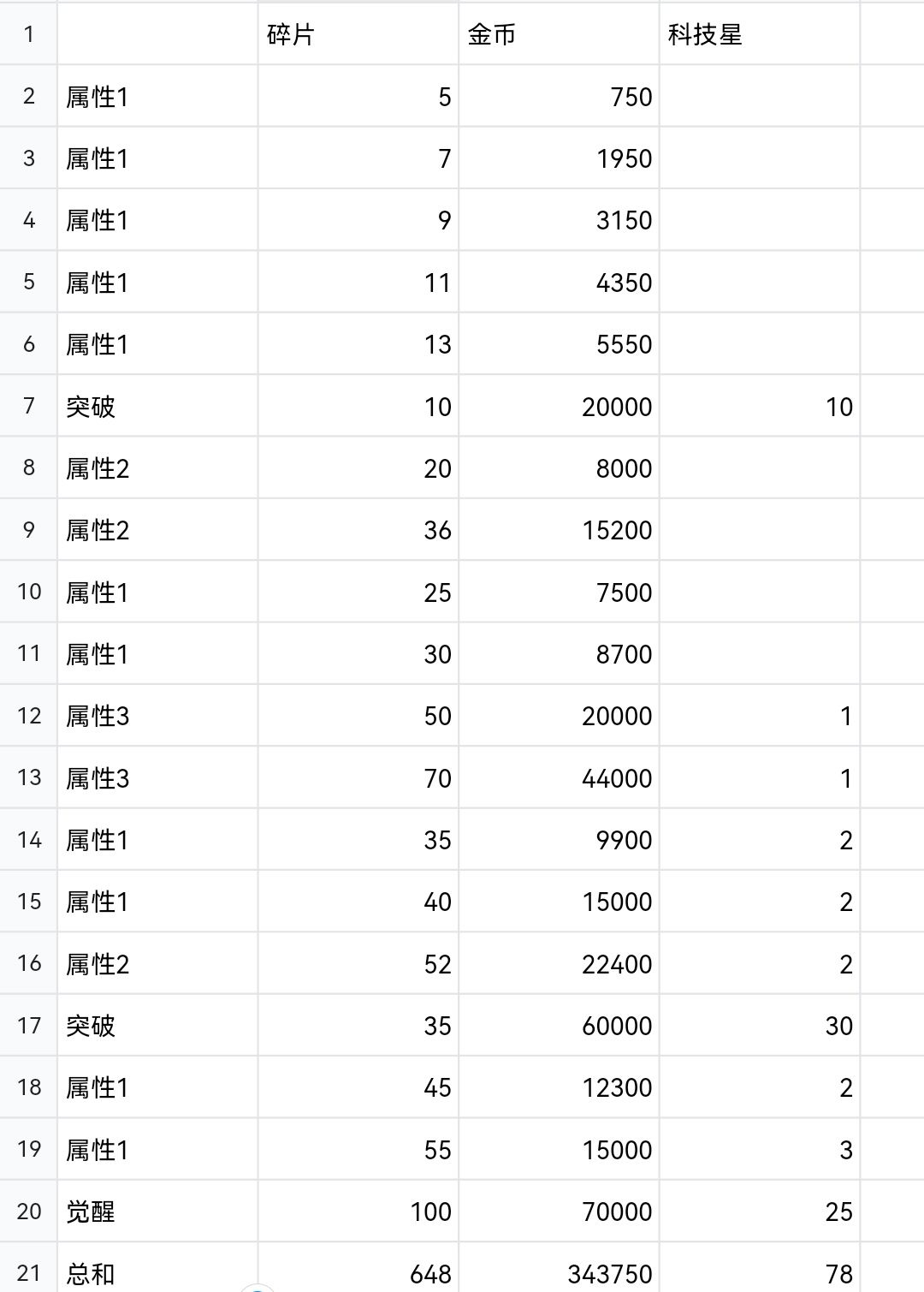 觉醒材料消耗表