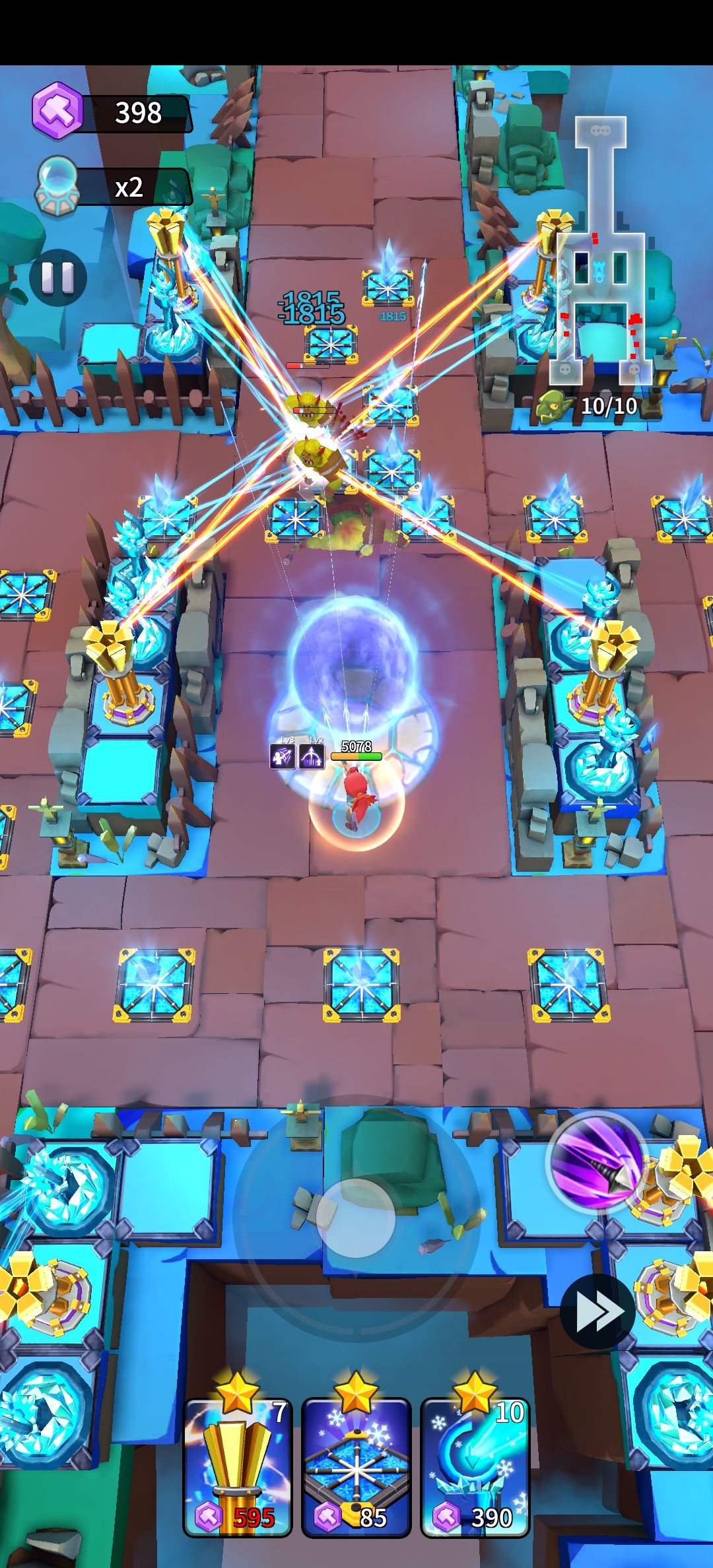 试了好几次想把怪物扼杀在第一行都失败了,塔不好的情况下只有劳累的命了。前面防御还没布起来的时候多跑跑肉身扛猪,因为塔是分散摆的可以将冰陷阱的放置尽量拖后,我放了三个冰陷阱,还有猪能跑出来,所以还是老老实实的分散布阵最好。想增加容错率就在两侧放两个冰陷阱,防止你还没反应过来猪就跑进去了。第二关最佳选手红毛野猪