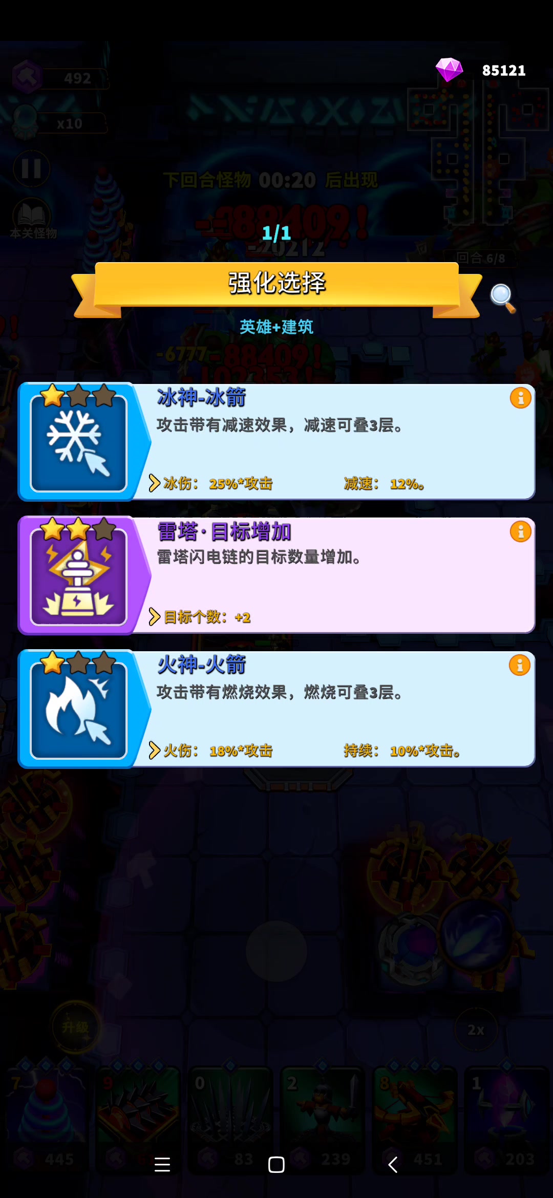 鄙人目前魔石选的是弩,所以局内升级也选弩,没有升级火塔,打boss没有那么轻松,如果打boss困难,三级火塔是比较适合的,第二波的时候我多放了一个切割,导致右边中间出怪口少放了一个传送,第二波怪物处理起来比较麻烦,魔8的打法思路就是依靠传送,因为左右两个出怪口没有纵深,用常规切割滚石堵门是堵不住的,配合上传送,主角就可以安心打鸟,碰到up活动,鄙人战力提升较快,魔8打法比较粗糙,本视频塔的位置是可