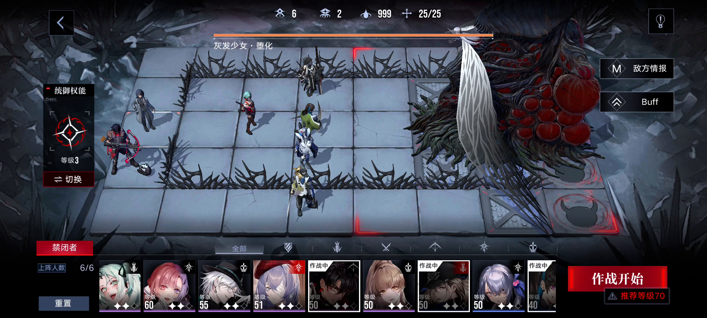 6层要一次过,第一次破核后伤害巨高,满盾迪蒙几针就被扎死了(๑ŏ ω ŏ๑)。 选启迪buff最好用3启迪+防御鸭,不要2启迪+启迪鸭。 叠盾3人+散装的流血破绽燃烧暴击召唤都试过了,最好打的阵容还是LL,迪蒙,000,哈梅尔,瑟琳,耶莱娜。LLbuff和3启迪必须有,其他优先度是000>瑟琳>哈梅尔=迪蒙,耶莱娜buff不刚需。6层想要一次过,最好是能刷出来瑟琳buff和圣剑/+12。 LL和0