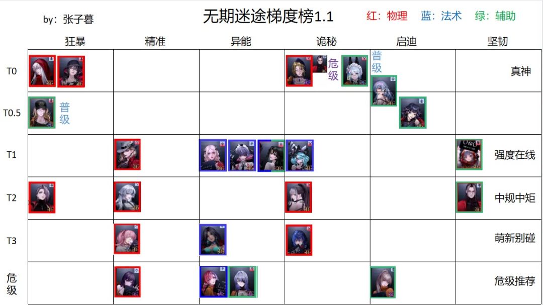 极强,全能,通用性极高!T0.5+! 建议抽取!枷锁0/3,0锁可用,3锁完美,考虑到周年还有猛的限定,非氪金党或者超级囤囤鼠,0锁本体就收手吧,能用! 重要能力解读 1 加攻击!大招建议一个石板30%群体伤害提升不收任何稀释,极为高贵!不管是流血物理法伤都能直线暴涨! 2 枷锁3 20%伤害提升会被背水稀释,但是充能下,约等于大招50%增伤!群体!非常恐怖! 3 驱散,高贵属性,以后再也不用担心