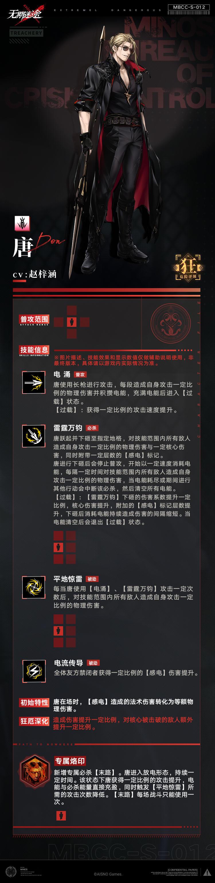 属于是拼图之一,半辅半C清杂向弱爆发,副C定位。 目前感电队拼图为,蕾,艾恩,唐,这三个都是副C,输出已经不低了,预计后续还会有一个狂级射手主C,和一个危级售后角色。(某个玩硬币的不想算过于不稳定还费步数) 技能不难理解,不做过多解读,破核增伤感电层数,需要普攻先进行过载。 从体系强度来说,应该不低,都是猛人(艾恩输出也不低),未来可期。 想玩这个体系的,需要考虑是否能接受要抽两个高命狂的代价(马