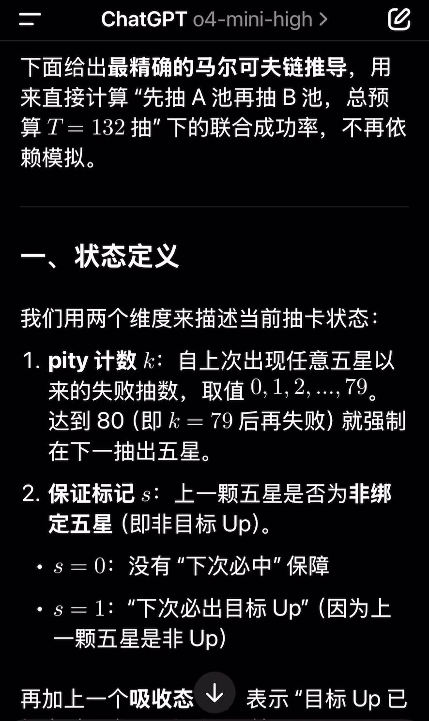 之前的帖子没有注意到原来池子的概率机制已经公开显示。这是看到坛友有用DS算了一下单狂的期望。也顺便测试一下最新的模型。就不模拟了,直接用这个马尔可夫链计算。但是结论和我之前的帖子相差毫微。 #无期迷途抽卡