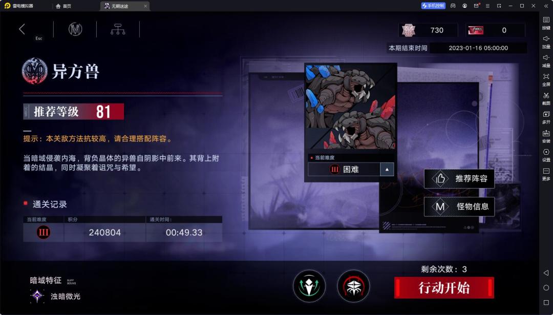 自己摸的轴,还没有看其他攻略,可能有疏漏之处望抛砖引玉 buff选的破核增伤和30血量,在boss第一次放技能刷新核心之前破核+灌伤害秒掉 全队81级,主要技能9,可以看出能量、伤害都是溢出的,仍有操作空间#无期迷途#无期迷途暗域