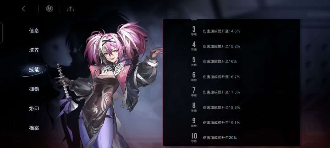帕加茜辐射妹,集控制(减速)、破核(九宫格破一核)、持续伤害(刮痧)于一体、遇到专属buff(辐射范围内受法术伤害+40%)可以做拐。 但是由于主打持续伤害(刮痧)这点就业受限破碎可以说少有上场机会处于不温不火的状态,要破核减速我掏娜恰就行了伤害还高,专属buff才能拐我有恩菲尔甚至破两核加恐惧,就说打剧情要减速我掏开尔文丽莎不需要投入太多资源直接上岗。等等因素看似完全没有养的必要或者说没有给三阶