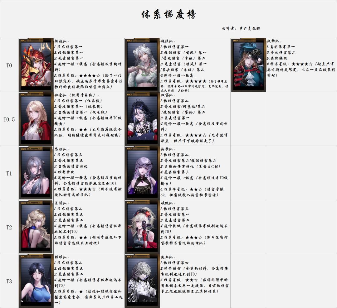 其他榜单攻略入口: 较上期调整说明: 啸风带队的物理超限元素队迎来版本最大红利、强势全面登顶; “折梅听雪”体系正式更名“虎啸山林”。 萌新入坑指南、梯度排行、抽卡规划、烙印搭配、配队建议(纯主观); 欢迎大家友好交流、指导评论,希望可以帮助到大家,谢谢~ #无期迷途创作征集 #无期迷途暗轨难明 #无期迷途攻略 #无期迷途