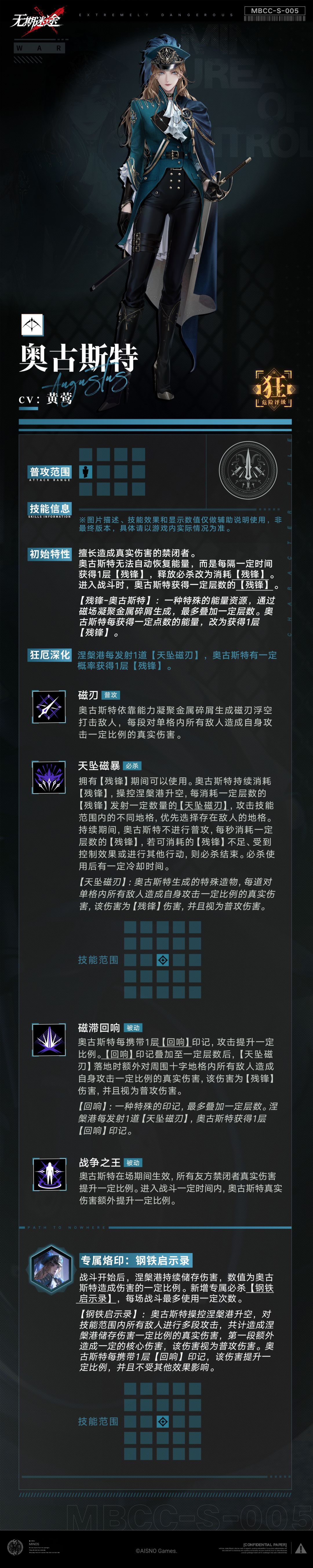 奥古斯特终于上线,一身戎装登场于2025最潮的臭豆腐游戏《局子之内》,欢迎退伍老兵莅临指导 总结:先说结论,奥古斯特,玩法非常简单,因为能量变成了残锋机制,所以开局就能放大,是非常轮椅的角色,而且由于是真伤伤害,所以能够无视防御直接输出,又由于是不能暴击的普攻伤害,导致能吃的乘区很少。关建锁为1和3枷锁,没有1枷锁伤害损失太多,3枷锁能够增加巨量输出和提供20易伤,4锁可以视作启动锁,能让被动