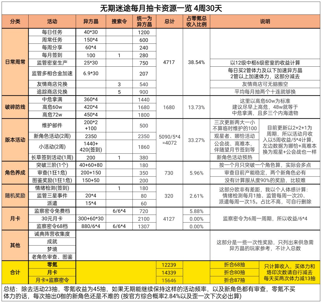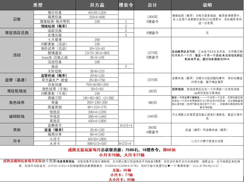 【无期】每月抽卡资源一览