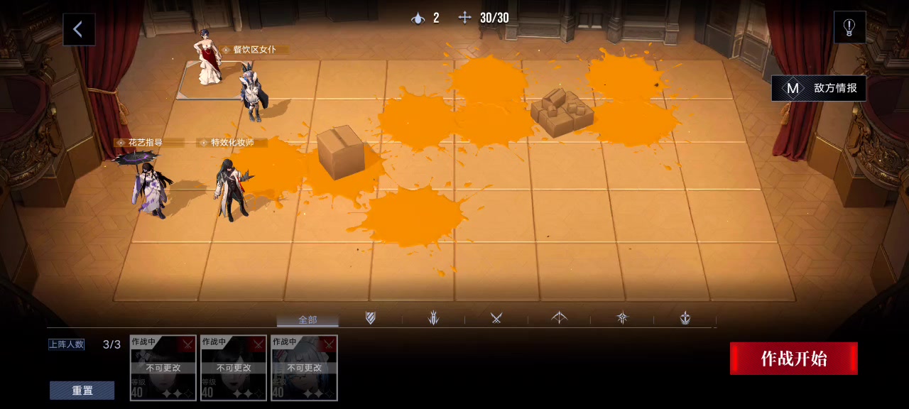 说一些注意点。列数为从右往左。 本人打了4次吧,每次失败的点都不一样,毕竟要一次次探索怪物的波次。所以得一次次调整。 先上练度,虽然没3破但也不低。 初始站位 核心角色:nox和女仆 女仆可以白姨替代。 迪蒙只是为了阻挡2个怪,艾瑞尔治疗,卓娅战士输出,观星者aoe输出,都有替代位。 1.第一波两个1核大刀怪可以卡在第2列用女仆同时破核,顺便将女仆大招叠至2层。一层原地释放增加清怪速度,一层从中间