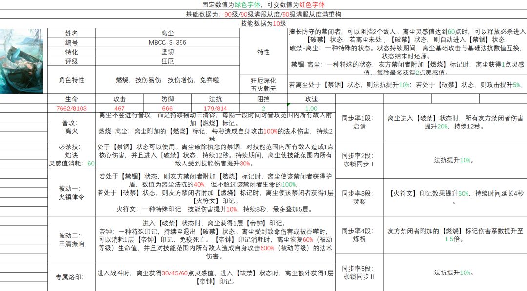 总结 1、离尘对于燃烧队的提升较大,但是没有大到到玛格丽塔之于破绽那种程度。 2、离尘不能换掉蓟,她俩的功能可以说是完全错开了。 3、离尘加入后,燃烧还是只能打短线。 4、玩燃烧推荐抽取要么0,要么4。 5、必须开专且至少二专,不开专的话可以不抽这个角色。 基础情况 面板技能 1、814的法抗不算重构全游第一算重构第二,而且因为法抗可以和攻击白值互换的原因,换过去后相当于她的攻击全游不算重构第二,