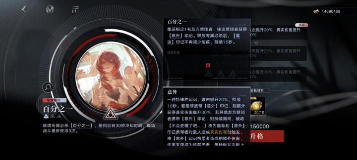 #无期迷途墨菲的日常 ⚠️维持原判,抽0,技能XX99,专一⚠️ 依旧不考虑主c情况,只讨论拐力:被动一提供40%普攻易伤,专烙提供30%攻击力加成,开专期间被动二提供76.8%额外倍率。 残锋队提升巨大,必抽拐❗️①40%普攻易伤相当于独立乘区②30%攻击力,即使凯瑟琳自带15%(4锁30%),源津提供27%,长线LL提供约8%该类buff,也等价17-20%提升③凯瑟琳每段必杀