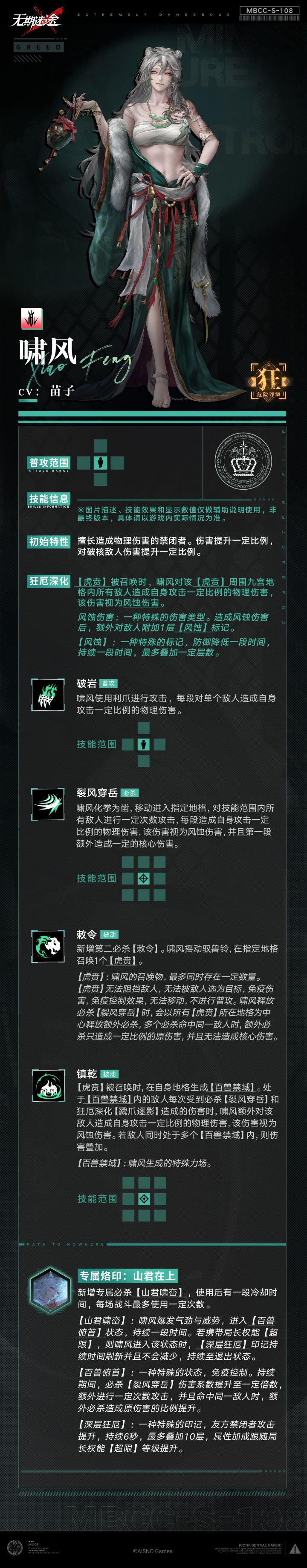 2月7日消息,《无期迷途》发布新角色【啸风】宣传PV及其技能模组,技能效果及动画质量十分感人。据已公布信息,【啸风】编号MBCC-S-108,组别无厌,稀有度狂,异能是号令百兽,从小被母虎养大,可以与百兽沟通,并用戴在手上的驭兽摇铃号令百兽随自己一同战斗。从技能效果来看,属于召唤系带有破核伤害和范围效果,且自带破防DEBUFF,强度较高。当然,如果只看动画效果那也值得入手,释放技能会召唤老虎