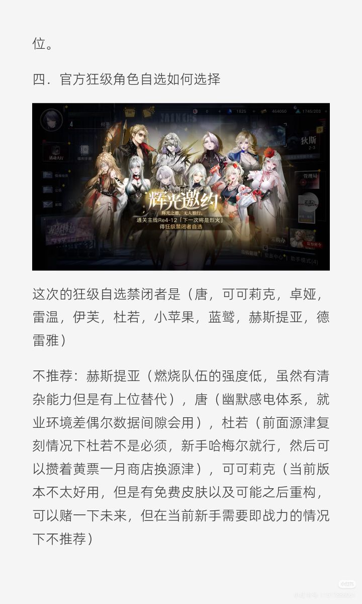 猫眼联动的时候入坑的,目前打到5-6了,才发现有个狂级自选没选,没几个狂,霁川是一眼爱上了所以抽了一个,目前还有一万四左右的钻。目前主要用诺克斯,耶莱娜,娜恰,艾瑞尔,赫卡忒,雷比尼斯,澈。正在一头雾水的玩,有无大佬给个发展方向和抽卡方向,感谢