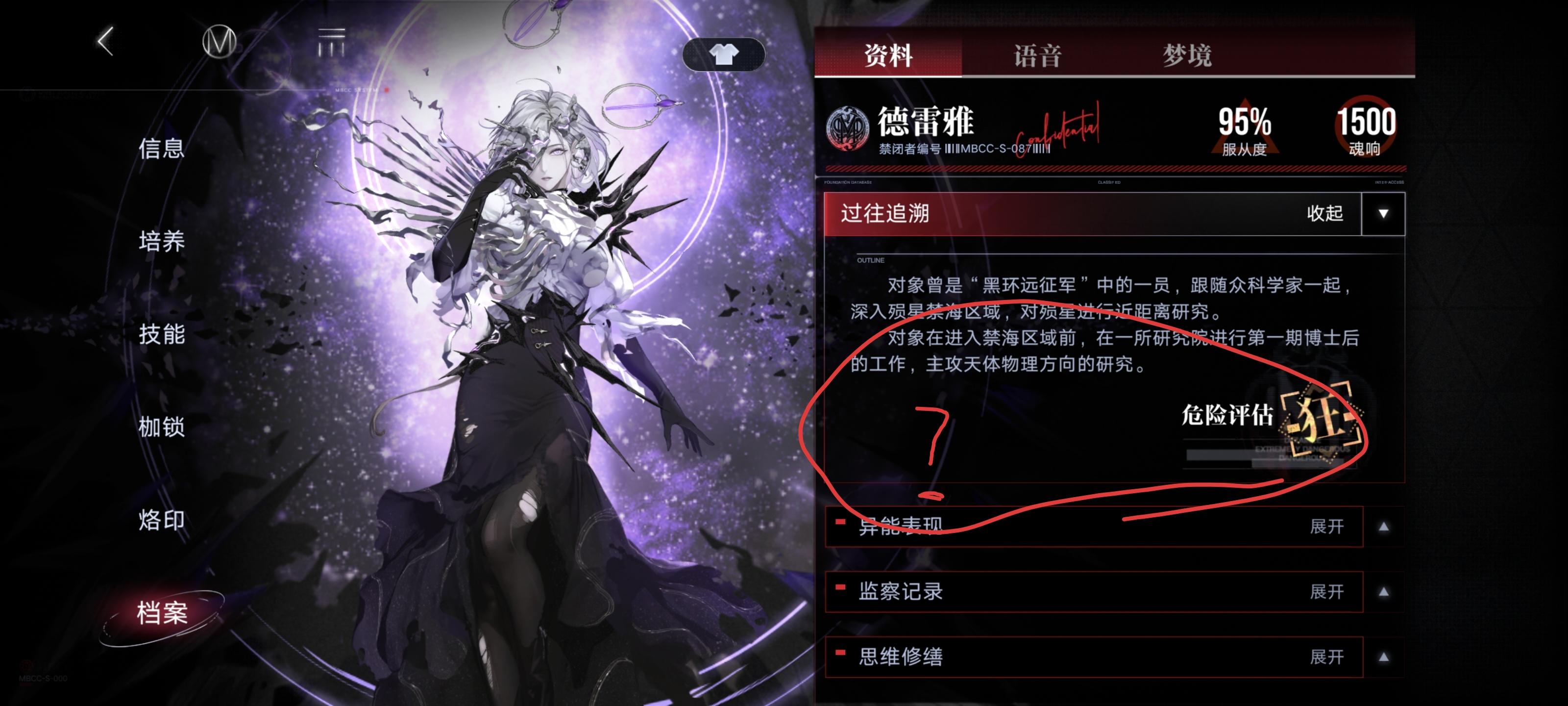 事先声明:不朽阵营禁闭者我抽了四个(离尘,源津,赫斯提亚,德雷雅),另外几个我是没有的(派尔琪雅,瓦尼菈,米格蕾),这些我看不到游戏内档案,只能在无期迷途wiki看一下做个参考,所以可能有些地方不准确。一. 德雷雅没有过往追溯第二条一般过往追溯第二条没有的禁闭者有这么几种情况:1. 剧情上(暂时)没有被收容- 可能主线有后续内容如:- 联动角色如:2. 特殊角色(这个条目被删除)如