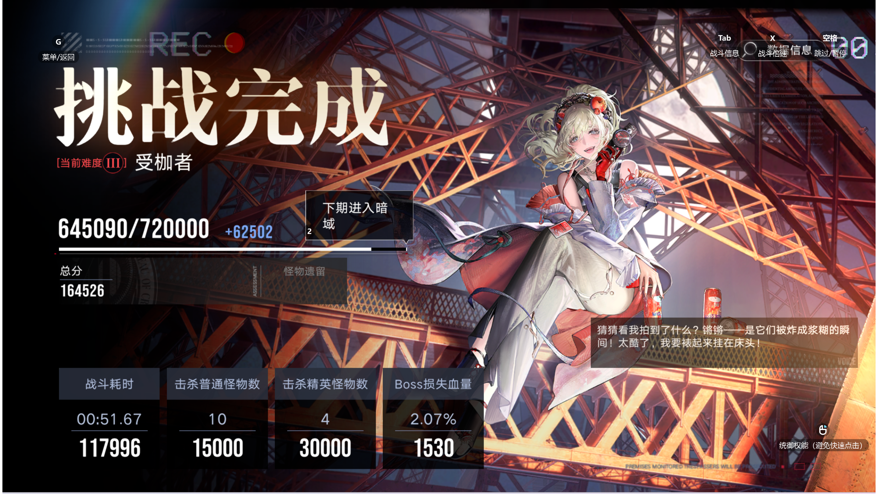 有点懒,还没查不知道是否已经有这样的攻略了因为我就一队物伤,完全打不疼,而且这个BOSS伤害还很高,我的源津也奶不住那么……速杀前两波小怪,然后移开所有角色让BOSS畅通无阻去和局长喝茶,爽吃时间分至少……比我认真打的高好多……(翻倍了都……)摆烂……什么时候才能有新的队伍呢……我的法蒸呢……追加:等等!怎么回事!怎么下周要去暗域了?哦,72W啊,那没事了……