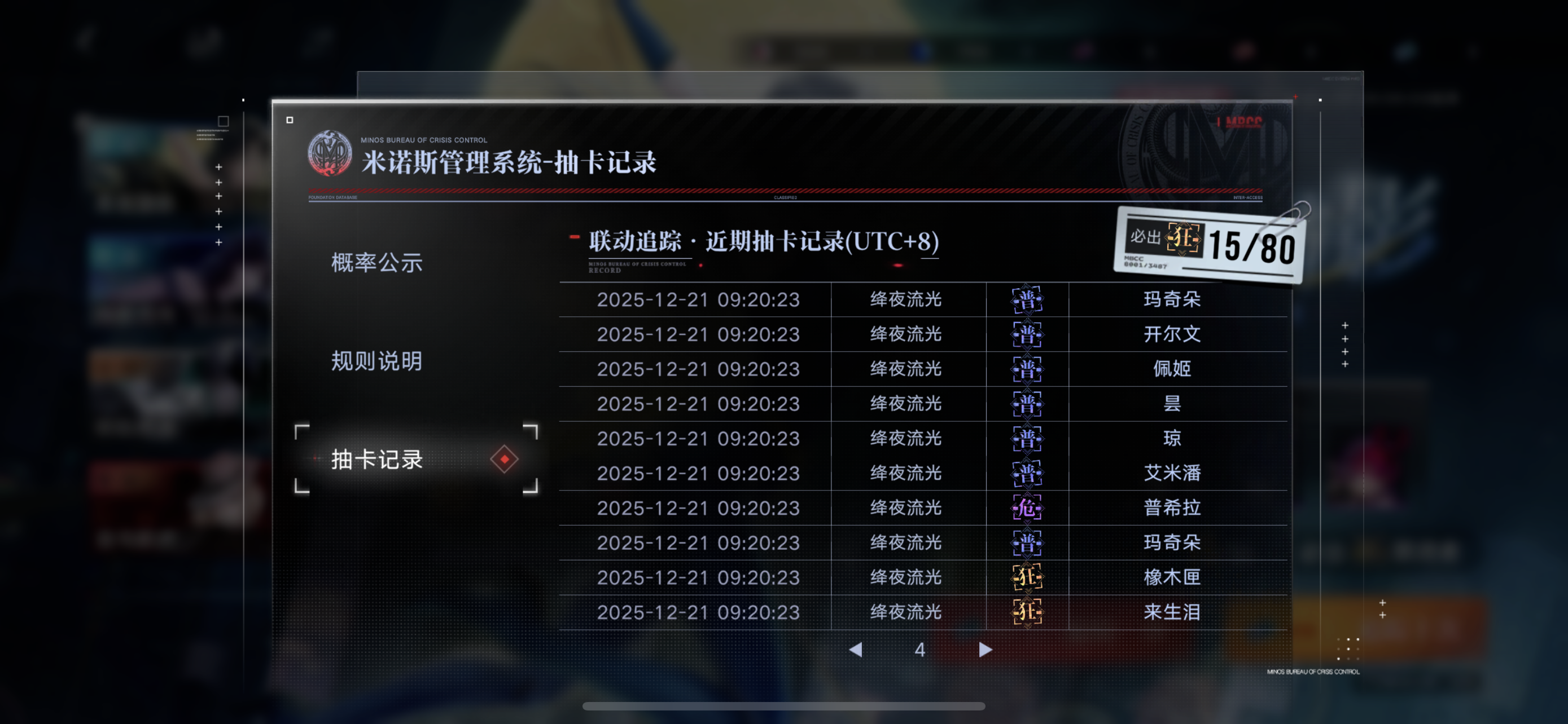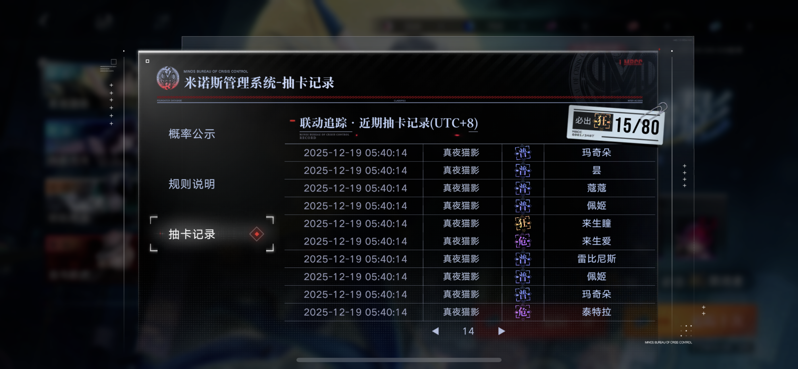 感觉我的号这次抽联动真的很欧两次三十连抽连着出金,两次十连双金(还是连在一起的20抽),拿了官方返的两个自选,猫眼配队也是可以毕业了300抽14金,加上57官方返的3金就有17金,玩抽卡游戏从来没有过这么爽的体验感谢57,感谢猫眼三姐妹