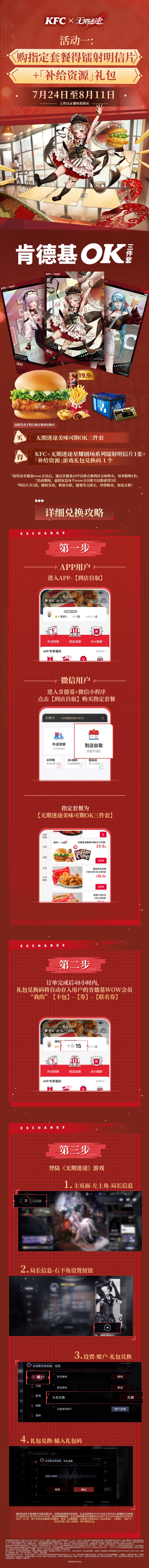 ▶KFC ×《无期迷途》联动详情介绍 ——KFC ×《无期迷途》全国联动将于7月21日正式开启!更多限定周边、主题店活动等详细攻略,请戳长图。▼点击图片,了解更多————————————【客服反馈】【官方网站】【官方微博】【官方微信公众号】搜索“无期迷途”【官方QQ交流群】《无期迷途》运营团队