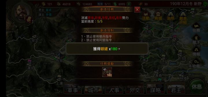 自帶自創角男女也行,寶物連珠國色恢復,屬性統75,武99,智90,政80,親和91,技能長臂,騎射,2匹強弓加馳射,飛燕馬,雁陣 玩法 開局把2個自創角升做軍師(可帶2萬人)再來把自己勢力武將都搬到洛陽,因為不能募兵,直接來編制一下,把所有兵力都給自創角每人2萬 之後再派一武將去許 次月2次訓練,直接開打曹操(不用搞研發,內政,民忠) 打完勝仗能登就登,不能登就斬 次月編輯一下 多出來的兵全解甲,