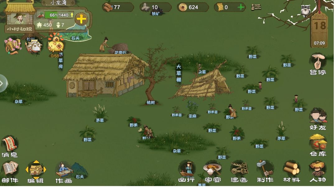 10月28日维护了,我没收到维护补偿啊。 首先,这是个好游戏。 我东山再起了两次,第一次和第二次饿死了。 游戏开始,前几步跟着提示做完,一个大草蓬,接下来记得是重点, 1村民采食物,资源采完会留下种子,第一时间种下去,不要犹豫这个是最重要的。 2.点头像看升级村子规模需要什么东西先把那个造出来。不要多造东西,比如砍竹子需要一个斧头就只造一个斧头,因为斧头需要木板,在村子升到3级小村初建之前木板会不够。 3,造房子造那个竹房,这个用的木板少,因为斧头需要木板。升到3级后,工坊出来了,可以挖石头和砍树,资源就不太缺了。 造房子就输出最大,需要几个民工就去几个,因为粮食一直在消耗,造的越快,粮食消耗越少。 尽可能的节省资源,任何资源都是。目前我东山再成刚到3级,,,,说的不对的话,大家见谅。