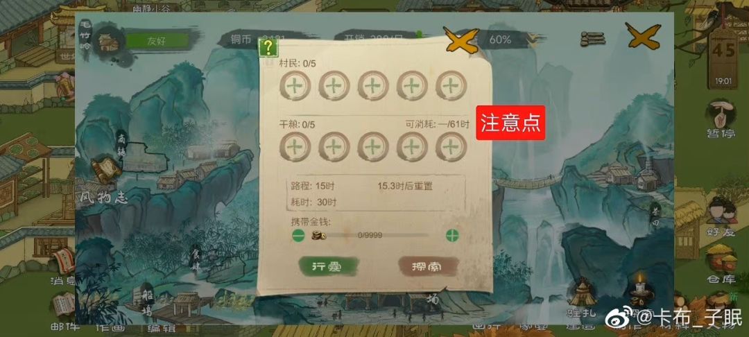 攻略第三弹🍉🍉 ①桃源记探索攻略🌸🌸 探索前置条件是有船坞,点击出行,选择要探索的村庄,再选择村民,干粮,行囊,铜钱,干粮要满足消耗时间,选好后点击探索,队伍就出发了(图一)。队伍到达目的地会随机遇到人才和当地商人,人才可招揽,商人可交易(图二图三)。商人会出售当地特产,图二“终止”右侧出现商人图标后即可交易。人才招纳最少要满足两个半❤️才可邀请,人才需要什么就送什么。需要注意的是招纳人数不能超过出行人数。即如果出行三个人是不能邀请四位人才的(图二图四)。探索结束后人才随同队伍一同回到桃源,可以选择孩童陪客,也可不选择。人才到达桃源无须再赠送物品,❤️会自动补满。补满后就可招纳(图五)。 ②桃源可建造资源🍗🍗 桃源可建造资源有农田,卤井,森林小屋,钓鱼台,鸡舍,北牧场,盐田。此处说明问题较多的鸡舍,北牧场,东山路的问题。要点一注意满足建设的桃源规模,鸡犬相闻可建造东山路,鸡舍。世外桃源才可建造北牧场(图六七八)。鸡在夏秋森林用兽皮弓打猎获得,获得后自动回到鸡舍(图九)。要点二注意鸡舍牧场饲料投放,以及不再生产时及时屠宰。 ③资源加工🍉🍉 原材料大都需要加工才能使用。稻麦生产的是原材料,需要进行加工才能使用。卤水可进行二次加工于盐田处生产盐。其他食物类可直接用于烹饪,无须加工