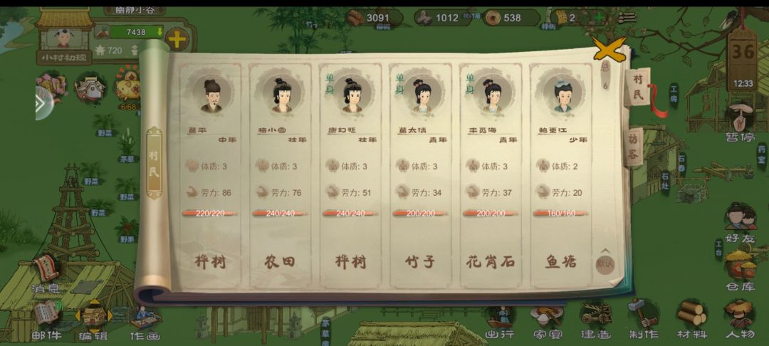 前言:这游戏是老婆在平板上玩的,然后推荐给我,安卓开服第一天第二天纯熟悉,第二天晚上7点熟悉了以后才正式开始玩 安居乐业后太卡了,删了些建筑,不然繁荣能到8000左右 1.人口:这个是重点,进去游戏后第一时间把任务做了,建工台出来,工台做完就存够木头70,石头40,让老头采集茅草,茅草足够了就马上建茅草房2个,建完差不多10点钟,然后暂停,把村庄升级,点出行让两个劳动力带上送的药+送的衣服去廖家村探索,运气好能直接拉2个人,拉到直接返回,人物刷新得快的话当天能回来,晚点也就第二天中午回来,出去后第一天会来狼,不用担心,没人的话它咬几口工台就走了,第二天一大早直接小女孩去第二个地图拉人(第一个图第二次去大概率碰不到人),这样第三天就能有6个人,后面就男女配对等生仔了,尽快达到10个人可以自动采集,这样轻松很多 2.资源:开局资源优先三个:石头,木头,竹子,人口多余就去采集野菜和亚麻还有葛草,石头木头后面一直都会很缺,有资源先两个桥,把右上和上面地图开了石灶和衣服造出来,存资源造工房,工房出来第一时间做梯子采集桃子(差不多第六,七天可以采集),第九天就去秋天了可以再采集一波桃子,商人点种子都要买上,工房出了就可以造房子去森林打猎,然后再造农田,就不怎么缺吃点了 3.后期:出去探索的时候第每个地图的木头和石头存200,铁块必须要买几百存着,第一任务做铁匠铺出来,缺哪个资源就去哪里探索商人买,铁匠铺做出来基本上可以算是毕业了,铁匠铺没出之前就一直做拨浪鼓卖,(夏天第一时间采集桃子,采集完了直接砍了马上种,夏天快结束点时候还可以再采集一波,等秋天长出来又可以采集了,一年可以3波),木材前期一直都非常缺,所以要注意木材点可持续发展 还有什么可以提出来我补充