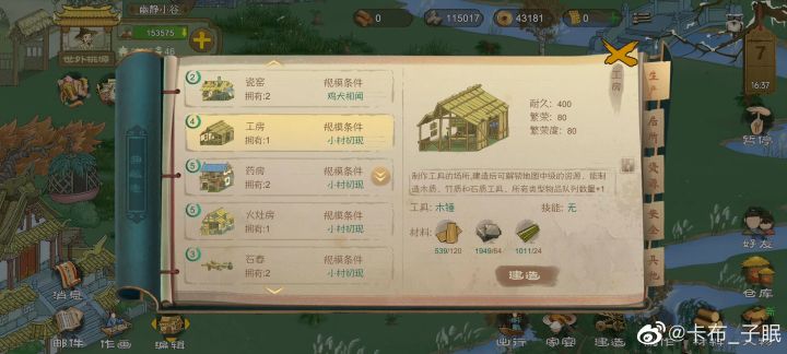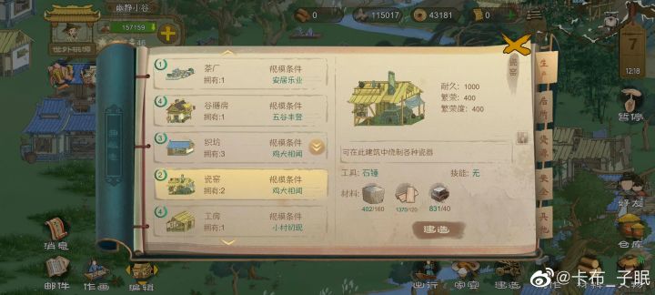 ②🌸砂浆和瓦片需要的建筑条件是瓷窑(图二三)而瓷窑在前期是可以造出来的所以没问题(图四)(花岗石 硬木板靠工房 而工房制作材料易得 铁块靠买!!!)(图五六七)。砂浆图纸在商人处购买后就可制作砂浆出来。瓦片前期自己挖不了桃泥所以也靠买!