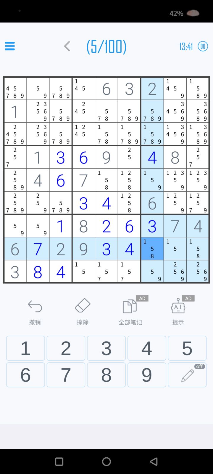 纯业务数独爱好者,数比数独是我最喜欢的一个模式了,主要原因是杀手数独太难了不太会搞,而其他的几种又太简单了没什么挑战~私心认为是玩过的数独app里最舒服的了,一键填充所有笔记yyds,一开始还会自己慢慢填,玩到后面就懒了打开数比数独上来就是先看广告填满再分析hhh提一些小小的建议哈,现在是点到某一个数字的时候所有含有这个数字(包括草稿)的格子会亮,这个挺好的,不过有的时候想看一个数字的分布,但