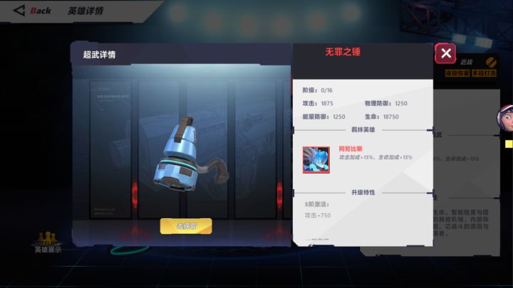 一、英雄阵营真理二、英雄类型传说英雄、红色三、英雄定位(审判官)近战、连锁伤害、多段打击四、英雄专用超级武器无罪之锤五、英雄怒气技能末日审判:消耗怒气500,对敌方全体造成300%伤害,使敌人进入[寒冷],攻速下降10%,怒气减少2点每秒,持续8秒,如果[寒冷]叠加至3层则目标被[冰冻]3秒。六、英雄背景故事诞生于未知年代的机械生命。智能程度与搭载武力都远甚于同时代的其他机械
