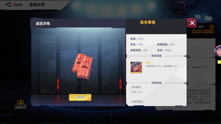 一、英雄阵营正义二、英雄类型史诗英雄、橙色三、英雄定位(无畏重拳)坦克、护盾肉盾、守护队友四、英雄专用超级武器裂变拳盾五、英雄怒气技能狂乱连击:消耗怒气500,对目标造成多次总计450%物理伤害,并给自己添加一个[护盾],护盾值为施法者150%攻击力,持续10秒。六、英雄背景故事著名生物学家,致力于对基因病毒改进的研究。为了找回在因为执行任务而失踪的妻子,他也随队深入了危险的