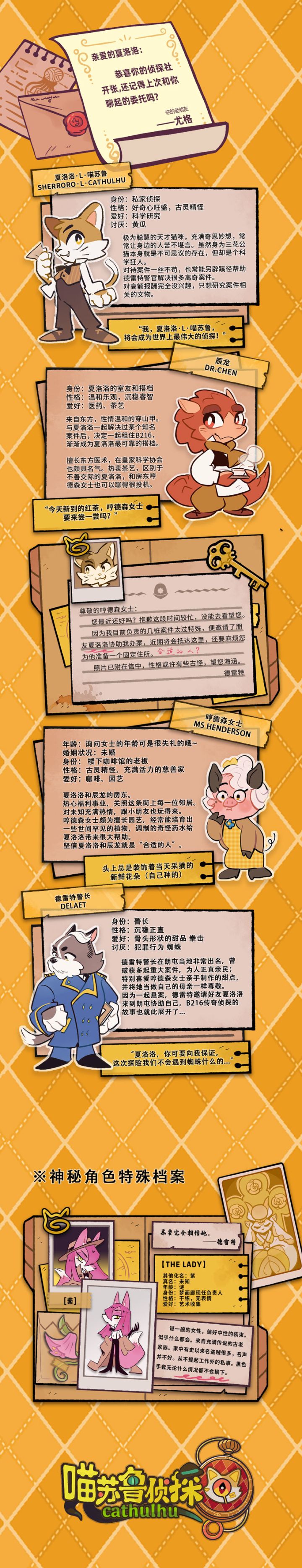 每位名侦探背后都有伙伴们的支持与帮助,期待在未来的故事中,夏洛洛会和他们发生更多的新奇故事!目前游戏正在加紧开发中,这期间也收到很多朋友的关注与鼓励。希望这些新面孔能够获得大家的喜欢,与大家在游戏中正式见面!
