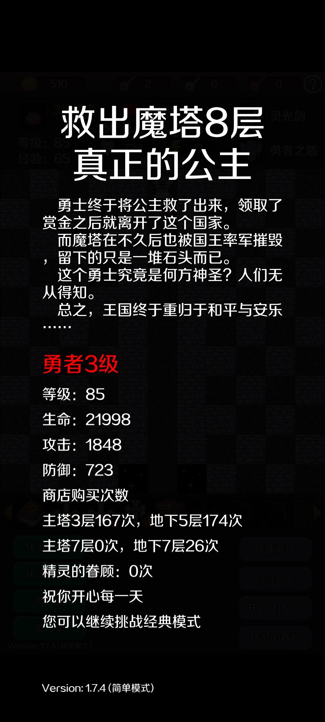 最后附上我的真结局通关数据:霸者3级,等级83,生命:6858,攻击1279,防御1255,商店购买次数,主塔3层158次,地下5层150;主塔7层9次,地下7层24次