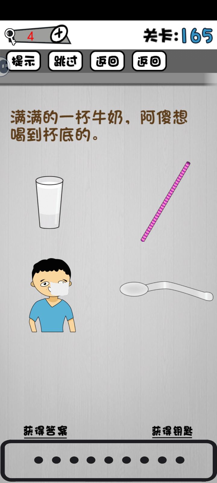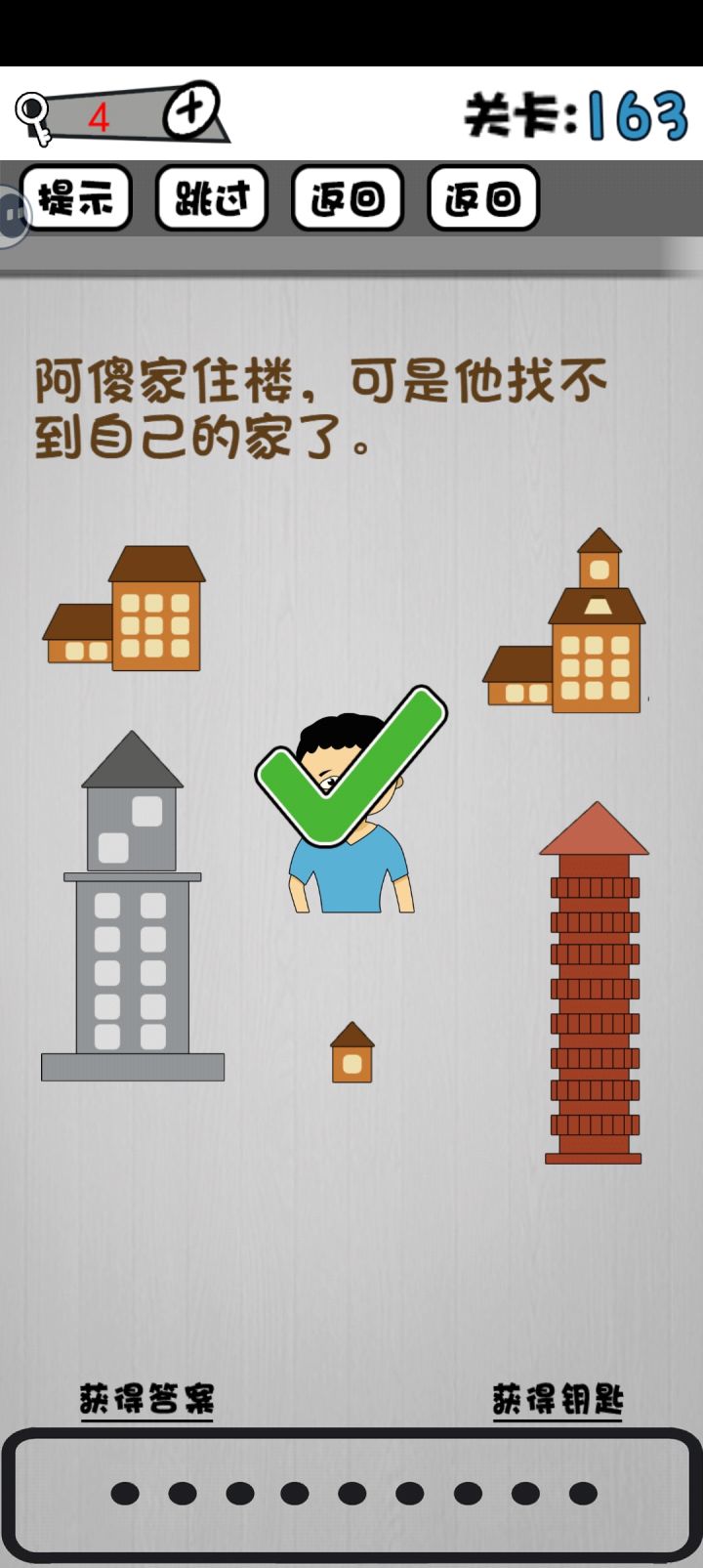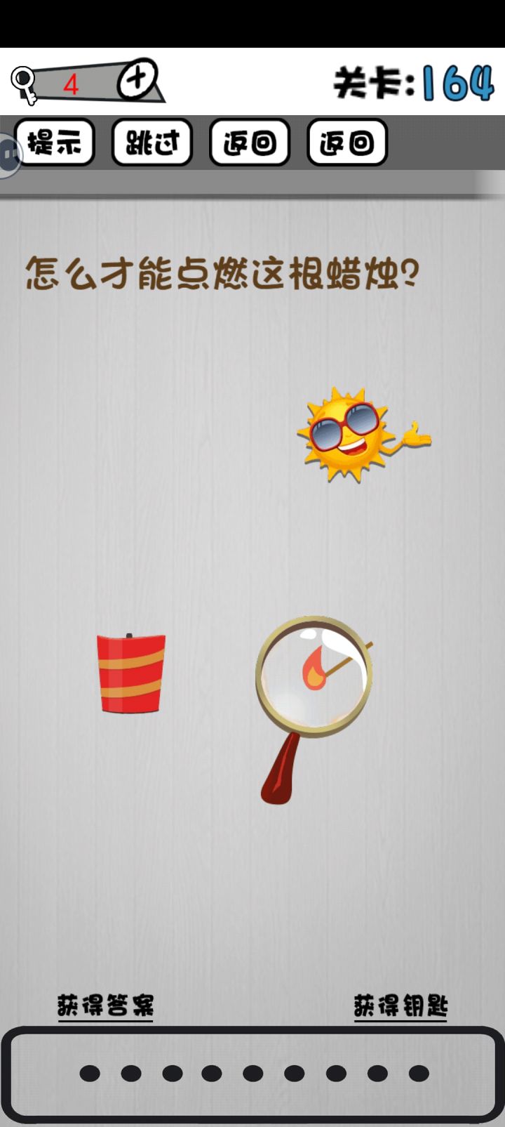 163,把灰色房子组合一下。164,重复的,依旧是放大镜点火柴,然后火柴点蜡烛。165,移动杯子下半部分的牛奶给他。166,重复关卡,把题目冰字两点移下来。167,手指擦掉字母上半部分。全部通关!!!