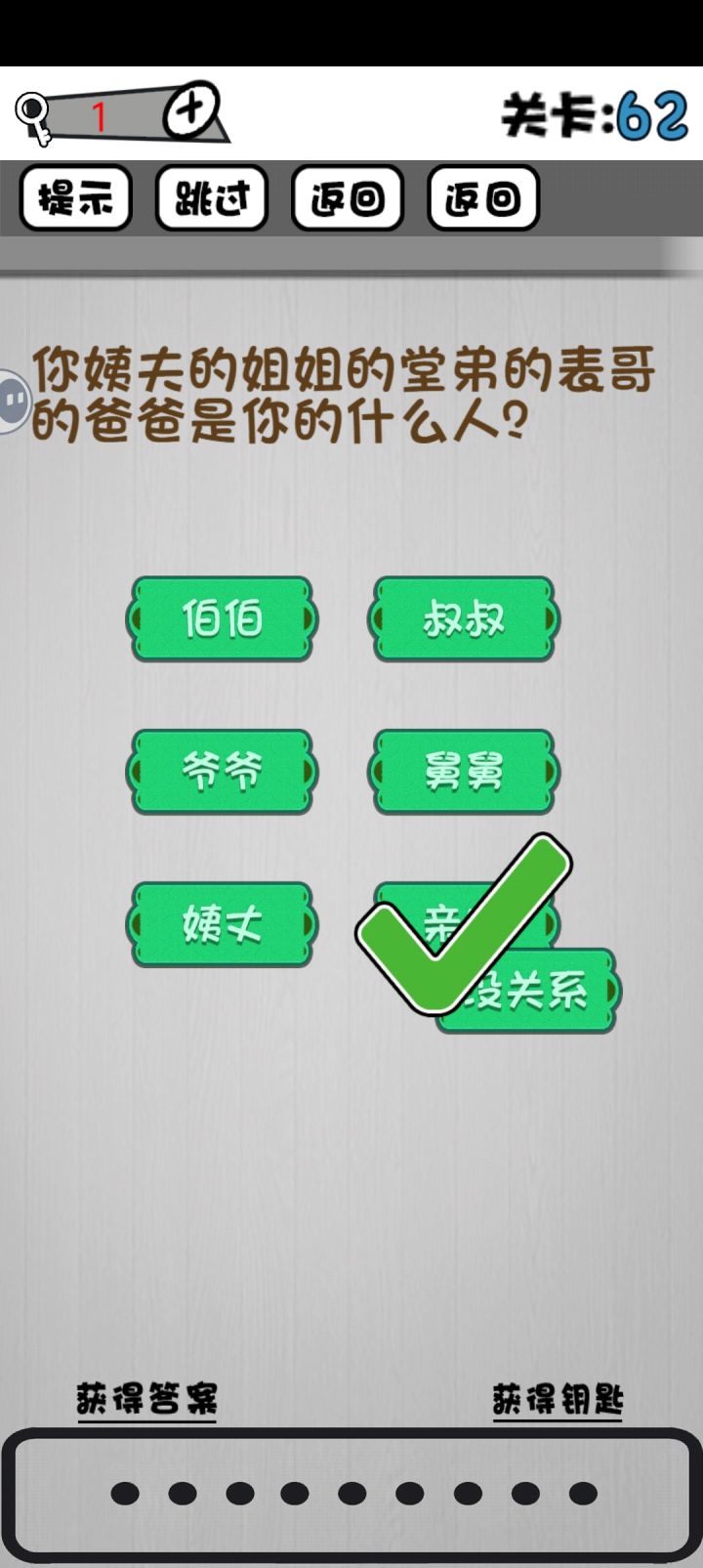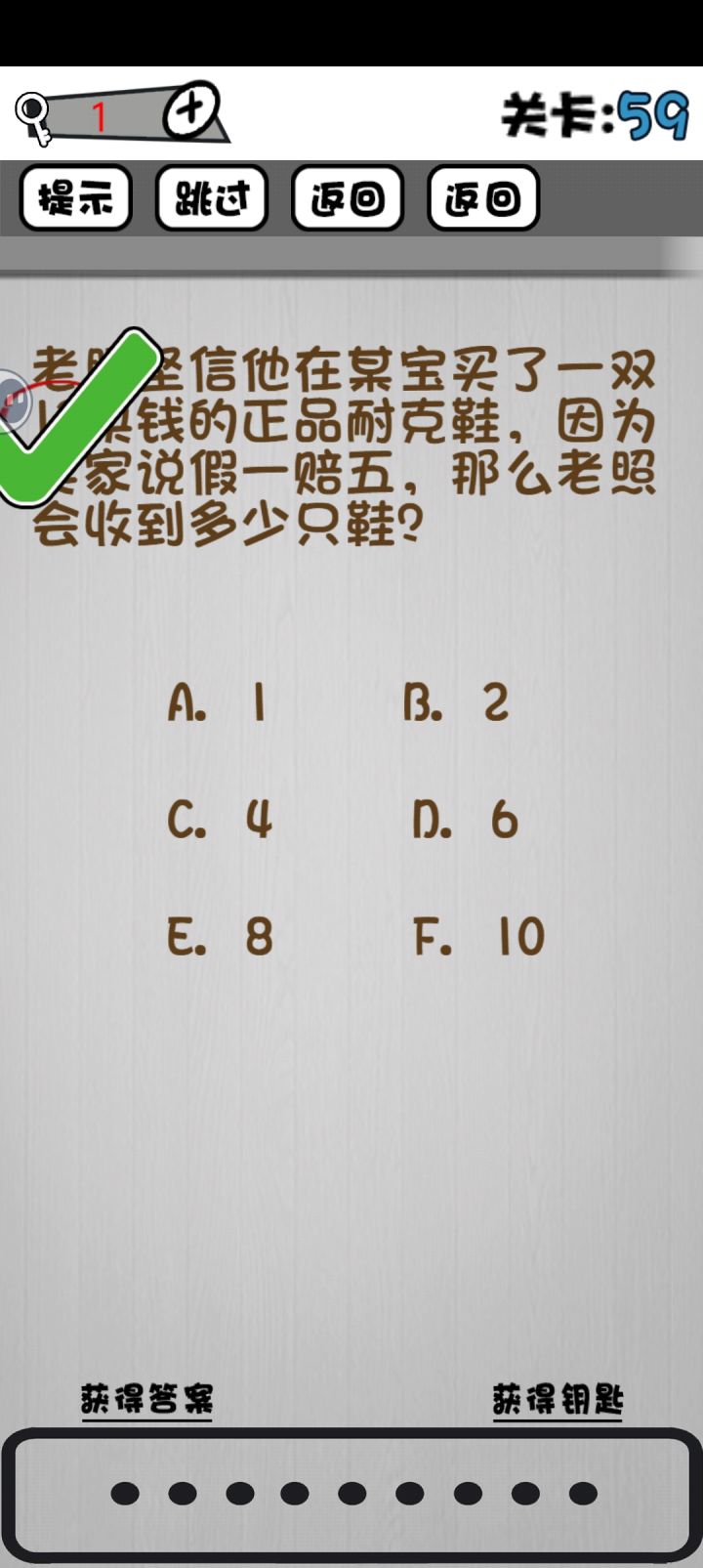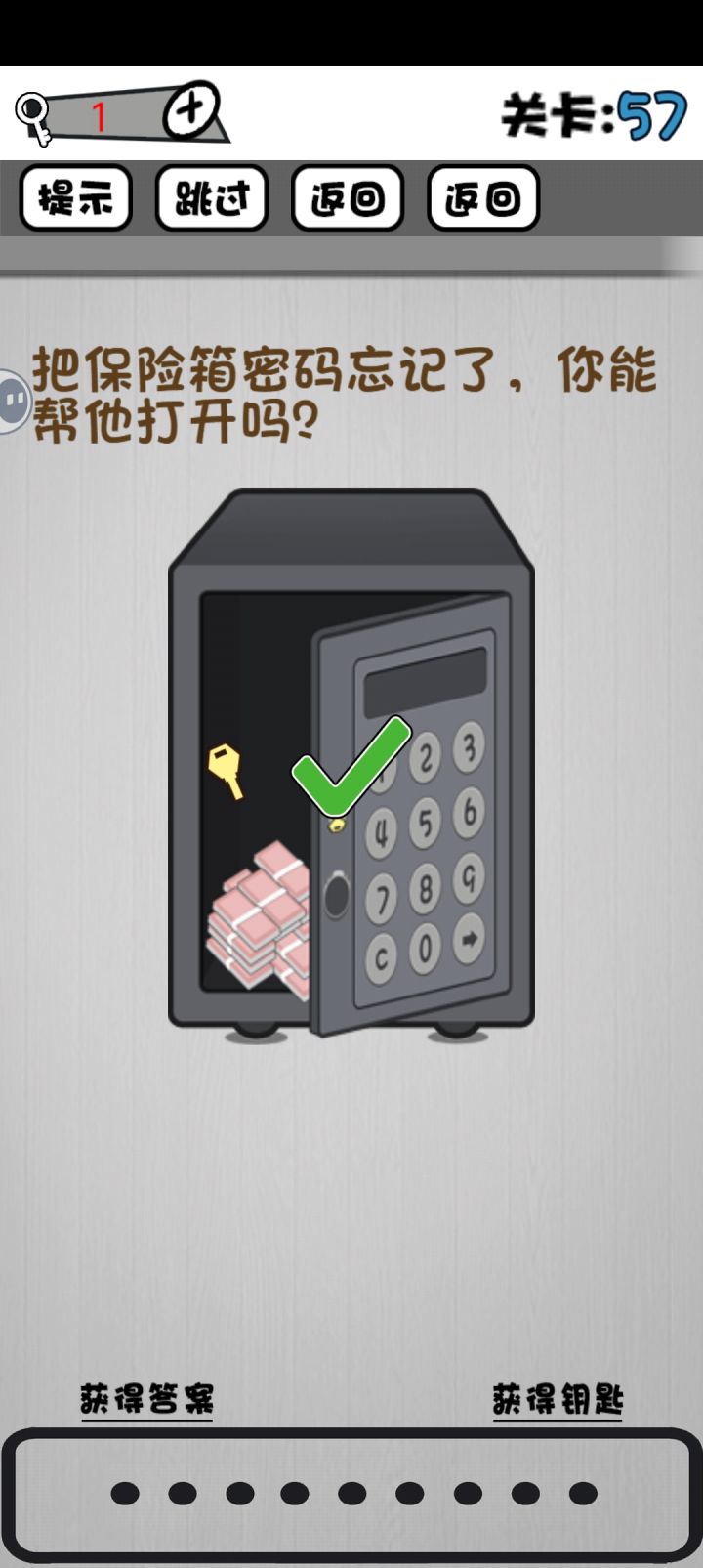 57,点提升上面的黄色钥匙。59,点题目上的“12”。60,分别点一下两根红线,人体导电嘛。64,两个0组合成无穷∞,无穷大。65,点题目上的“一”,唐僧师徒,只有他是人。