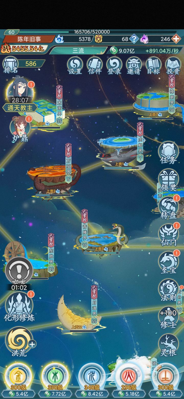 以下攻略欢迎各位补充。游戏设定:主角为一个世界的统治者,也就是洪荒世界的天道,去征战其他世界,并把其他世界大能做成自己的鼎炉。等级设定:每五级一个阶段,每过五级开启下一个世界,当前战力如果是征战世界的三倍则可以直接掌控,升级是靠天道分身,天道分身一共十个,靠功德开启。功德前期在投资里可以获得,开启任务后就可以从任务里获取。战力设定:首先是升级,给少量的战力。其次就是大能出世,类似在