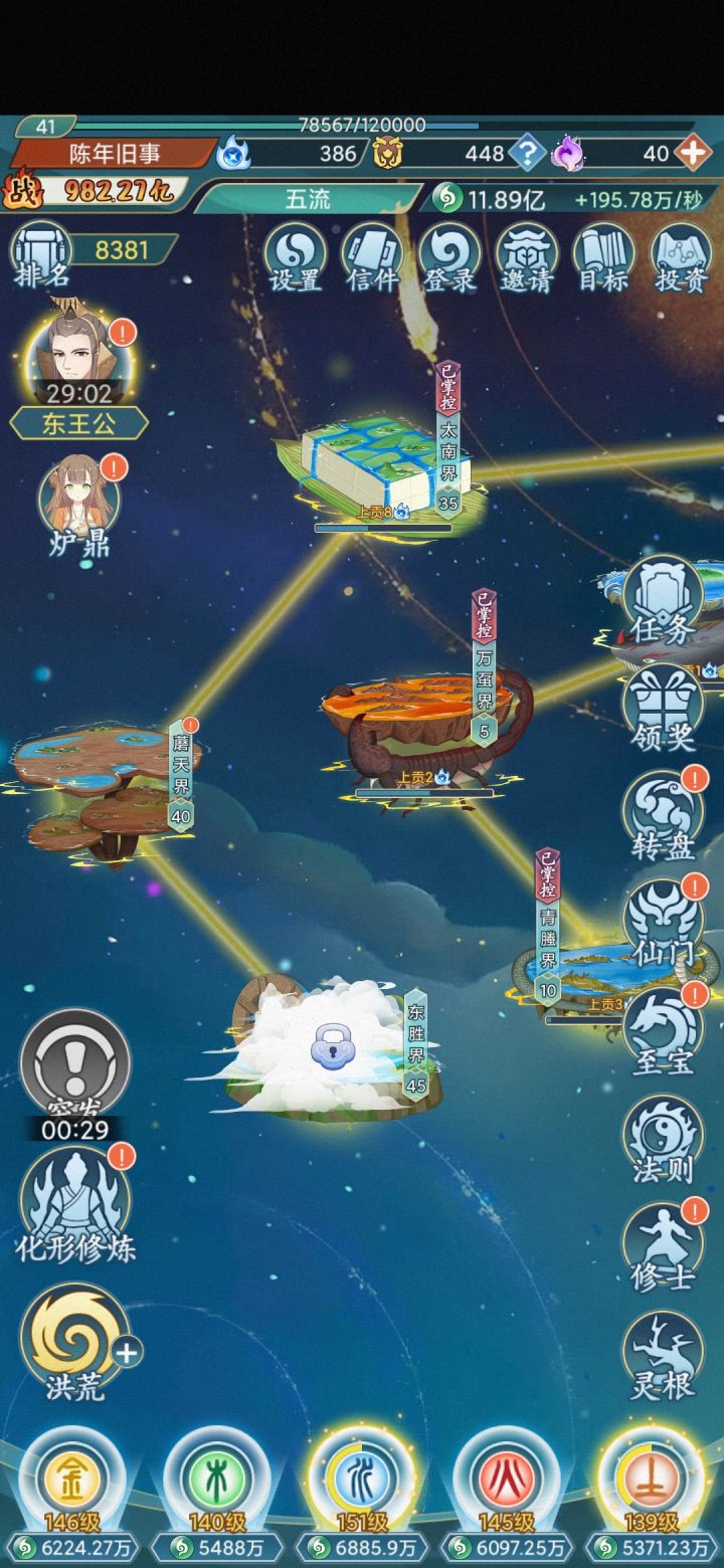 游戏玩了24天,到了第十八天开始起,级别升满,至宝,仙门,法则,修士,灵根,全部都升到满级,然后就是混日子了,这个游戏也就是让新人进去点广告的,完全没有任何发展和盼望的