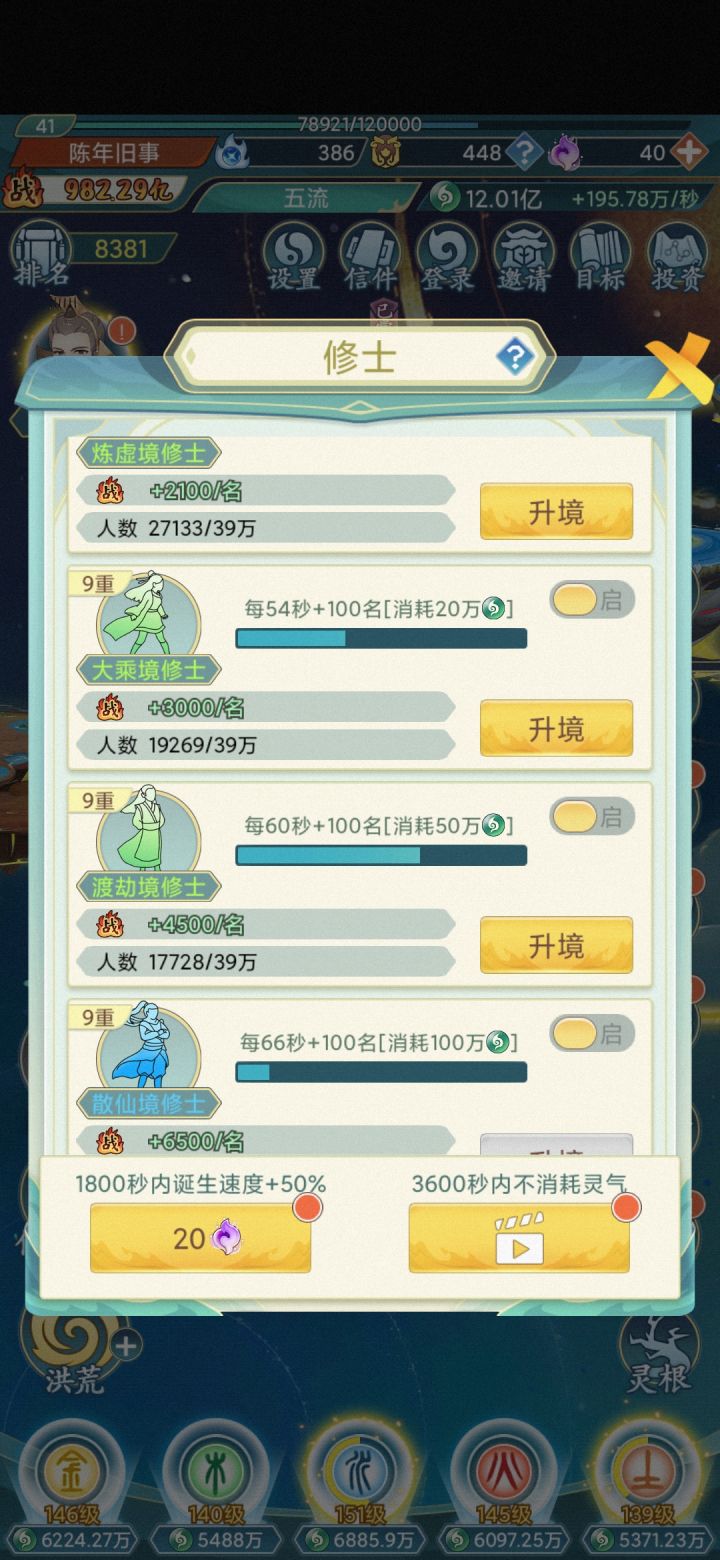 游戏不错,就是看广告太频繁了。因人而异吧。攻略很简单,能接受看广告,你就能成为大佬。讲三点,前期功德,本源,仙玉不要乱用,修士用本源升级9重,灵根用仙玉升级到20重,解锁一个就升满。灵气根据解锁灵根的提示升级就行。接受挂机时间的,就把多挂机,争取把大能多弄出来,然后解锁仙府宗门等,这些都是快速提升战力的。 中间那个几流一定要点,这样能解锁新的东西。最后说一个 不要把修士拿去升境,太亏了,我损失了