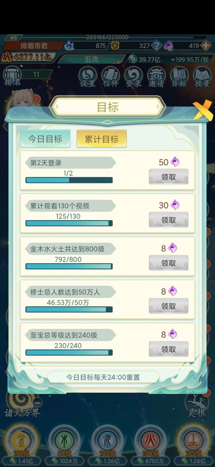 以下攻略欢迎各位补充。游戏设定:主角为一个世界的统治者,也就是洪荒世界的天道,去征战其他世界,并把其他世界大能做成自己的鼎炉。等级设定:每五级一个阶段,每过五级开启下一个世界,当前战力如果是征战世界的三倍则可以直接掌控,升级是靠天道分身,天道分身一共十个,靠功德开启。功德前期在投资里可以获得,开启任务后就可以从任务里获取。战力设定:首先是升级,给少量的战力。其次就是大能出世,类似在