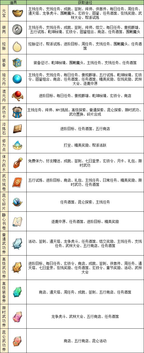 在《挂出个大侠》中,有许多日常要用到的游戏资源。乔妹也看到有玩家反馈的体力不够用、武功券难攒的问题。那么怎么样最快获得想要的资源,它们又分别都有哪些途径产出呢?乔妹为大家整理成了表格,快收藏起来吧!【新增以下道具获取途径】昆仑碎片、装备、淬炼石、经脉、修为点、静心书卷、高级装备券、限时武功券、昆仑武功券
