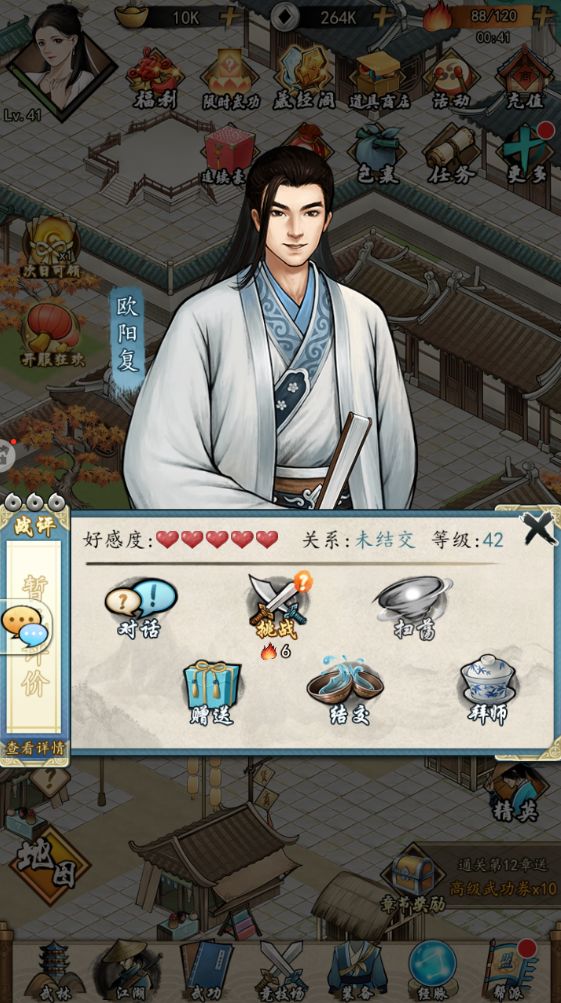 三人行必有我师,而在《挂出个大侠》的江湖游历中,每个地图的每个NPC都可以成为拜师的对象。今天让灵儿为少侠们介绍一下拜师系统吧!当与某一“江湖中人”的好友度达到满红心时,可激活拜师功能(送什么东西都可以提升好友度,推荐送银两、酒、花)。不同NPC成功拜师后可获得不同的奖励,最好的能送金色内功和武功。注意一点,只能同时拜一人为师,如更改需要先挑战原来的师父进行出师哦。【玩法入口】全地图【