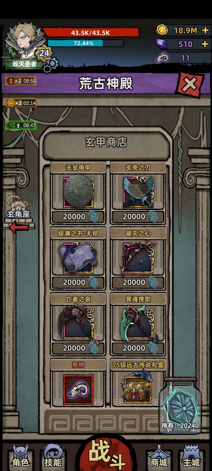 一些无关紧要的事1. 开头可以跳过的那个动画,只要完完整整的看完一遍,以后就不会再出现了,当然,每次点跳过也可以2.猎魔,勇者的技能,没抽到想要的不要选,直接后台强退就可以重新选了。3.不用急着刷唤醒,就随便点想要的那一类,通关周目五也是无压力的(魔法师除外)4. 世界boss至宝。把材料调成9,出远古传说的的概率会变大。5.以下几种,都是可以用强退来刷的(强退以后材料还在):秘藏套装的