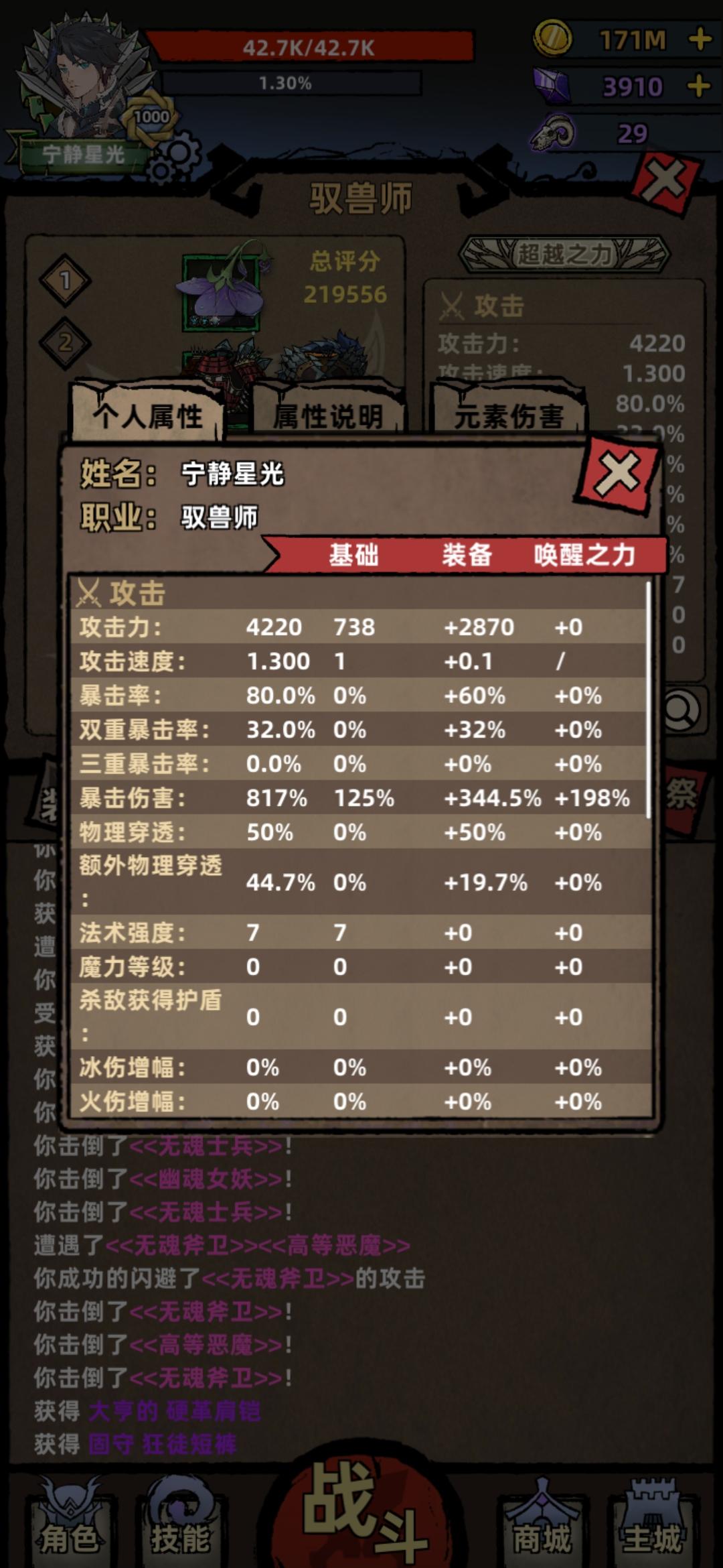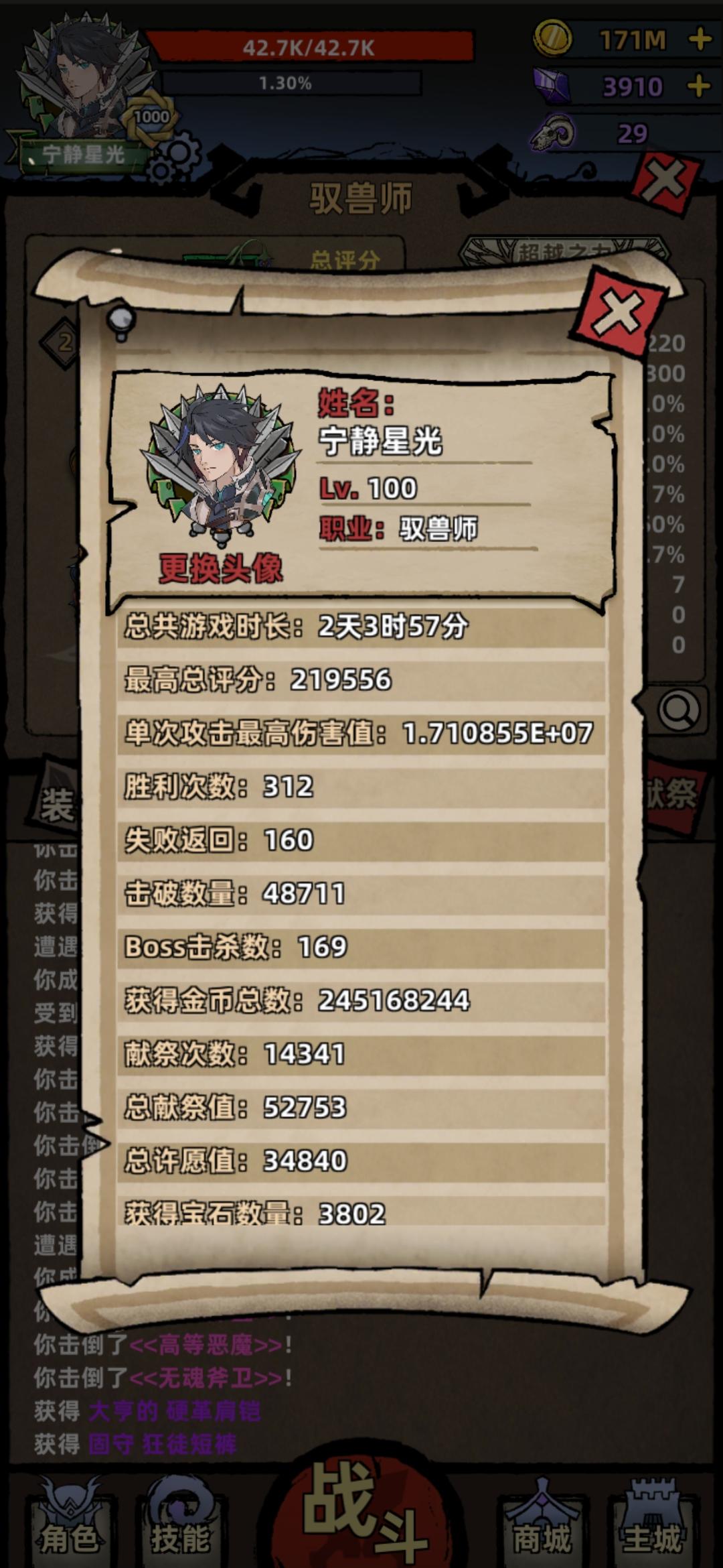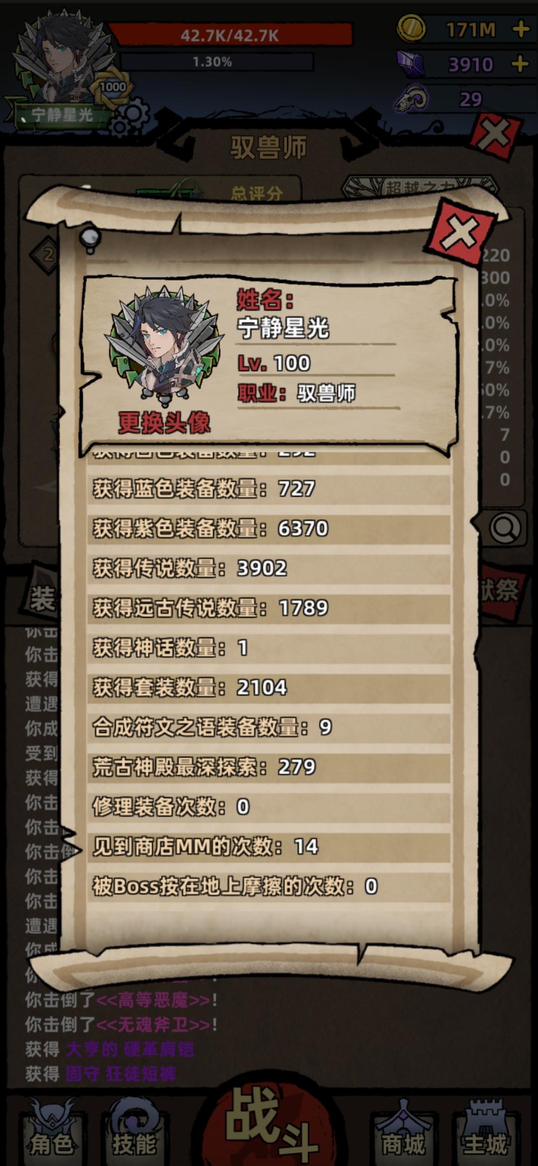 emmmm,先赞下游戏,竖屏可摸鱼,无氪金点,装备搭配有深度。就是职业强弱有差,不过现在才上手没多久,希望研究过其他职业后找到更多乐趣。入门级装备,熟练点估计几个小时就能打到这个程度了。